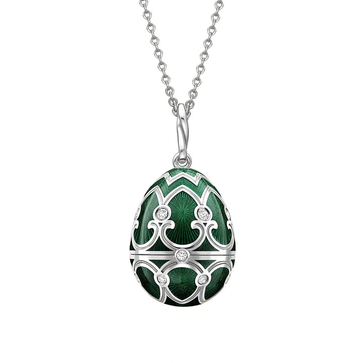 Crafted in 18k white and yellow gold, featuring green lacquer, amazonite stone, and white diamonds. The locket is hand-painted with dark green guilloché enamel and suspended on a 50cm 18k white gold chain.