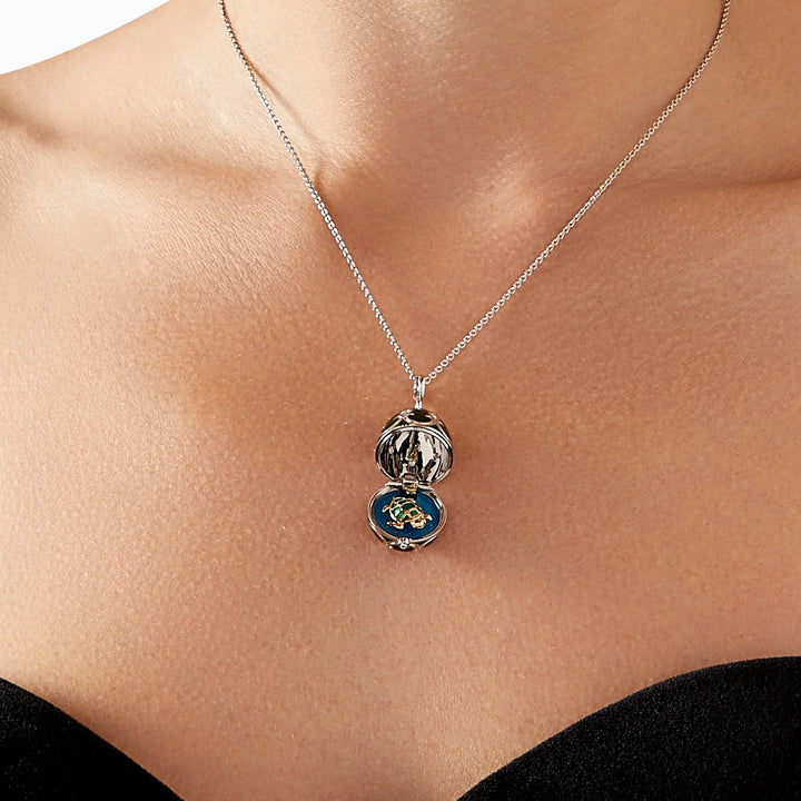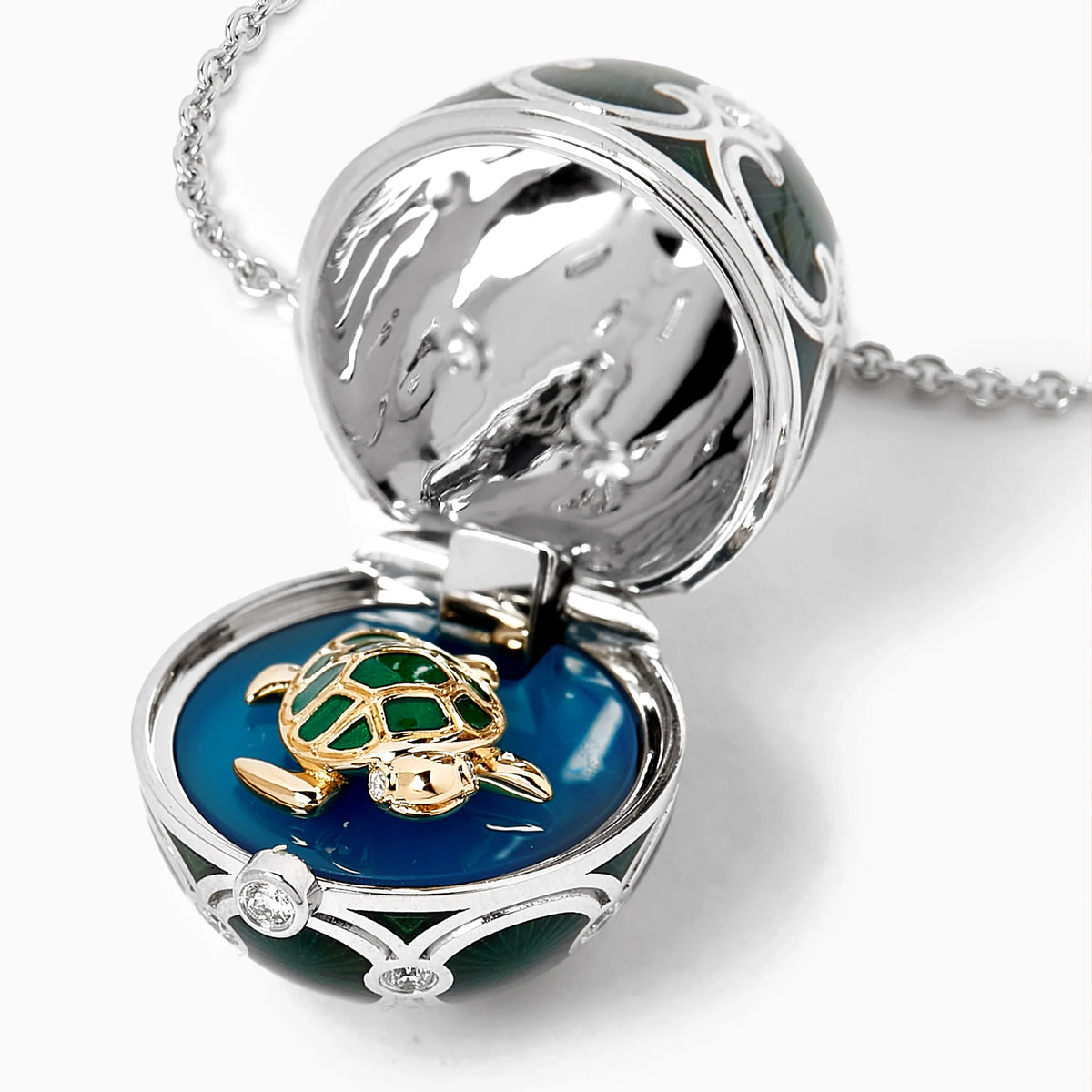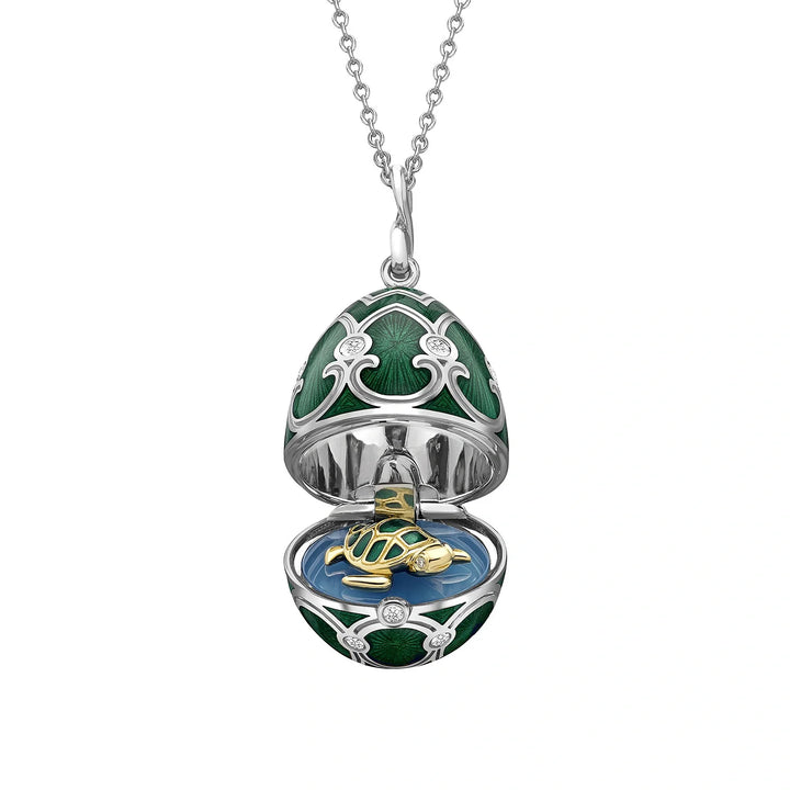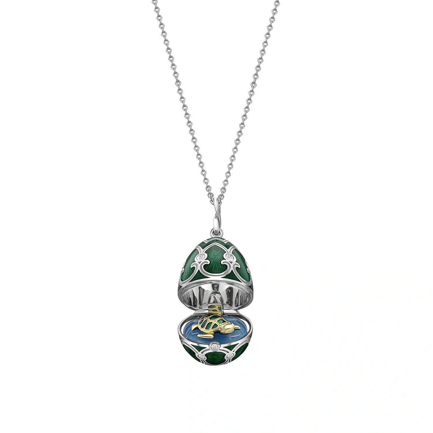 The Fabergé Heritage Turtle Surprise Locket is a charming and playful piece that showcases Fabergé's love for surprise and wit. The locket features an adorable turtle crafted from 18k white and yellow gold, coated in green lacquer, with tiny white diamond eyes. This little creature sits atop an amazonite stone, which gives a beautiful blue, water-like effect. The locket is hand-painted with dark green guilloché enamel and embellished with white diamonds. Suspended on an 18k white gold 50cm chain, this 22mm egg-shaped locket is a true statement of craftsmanship and creativity.