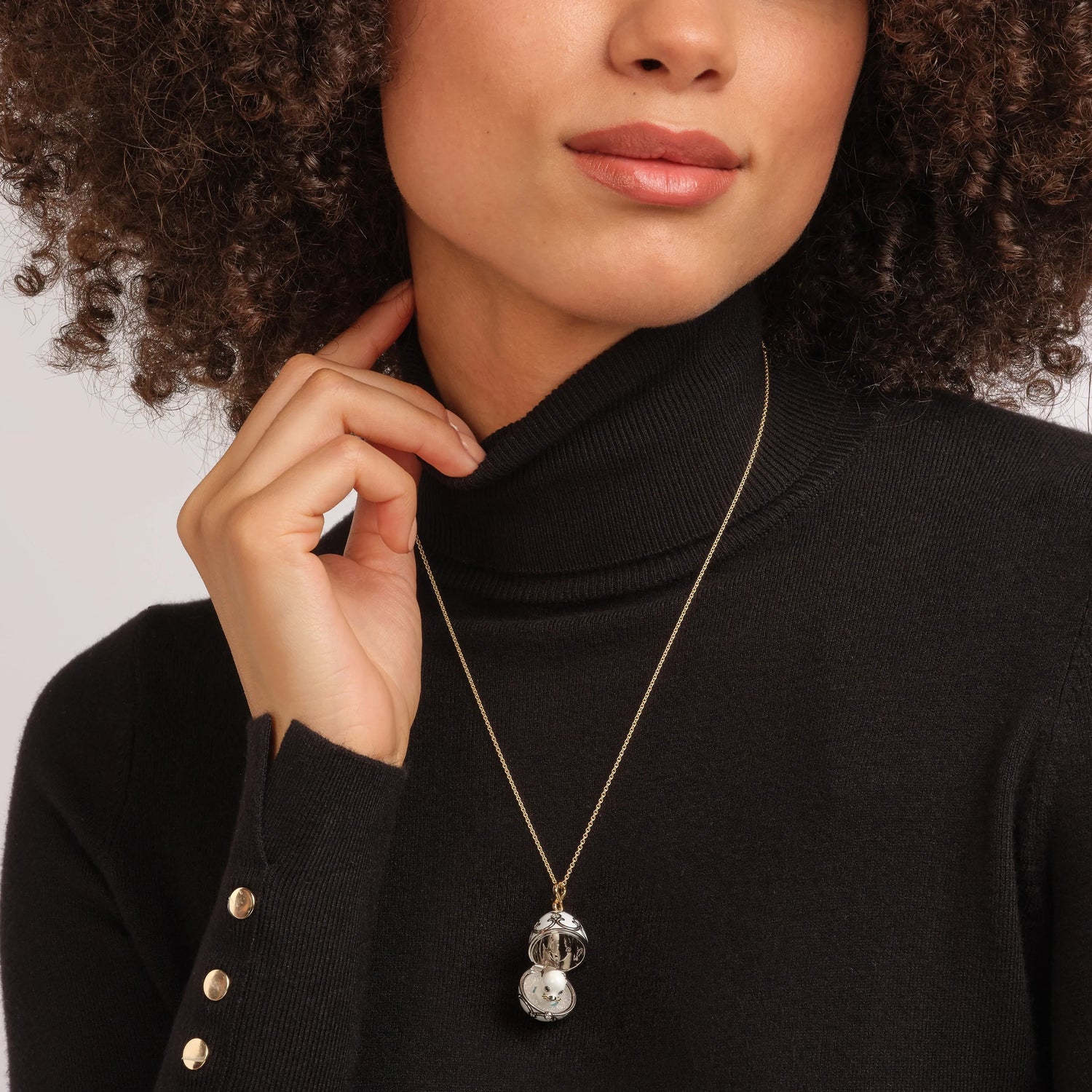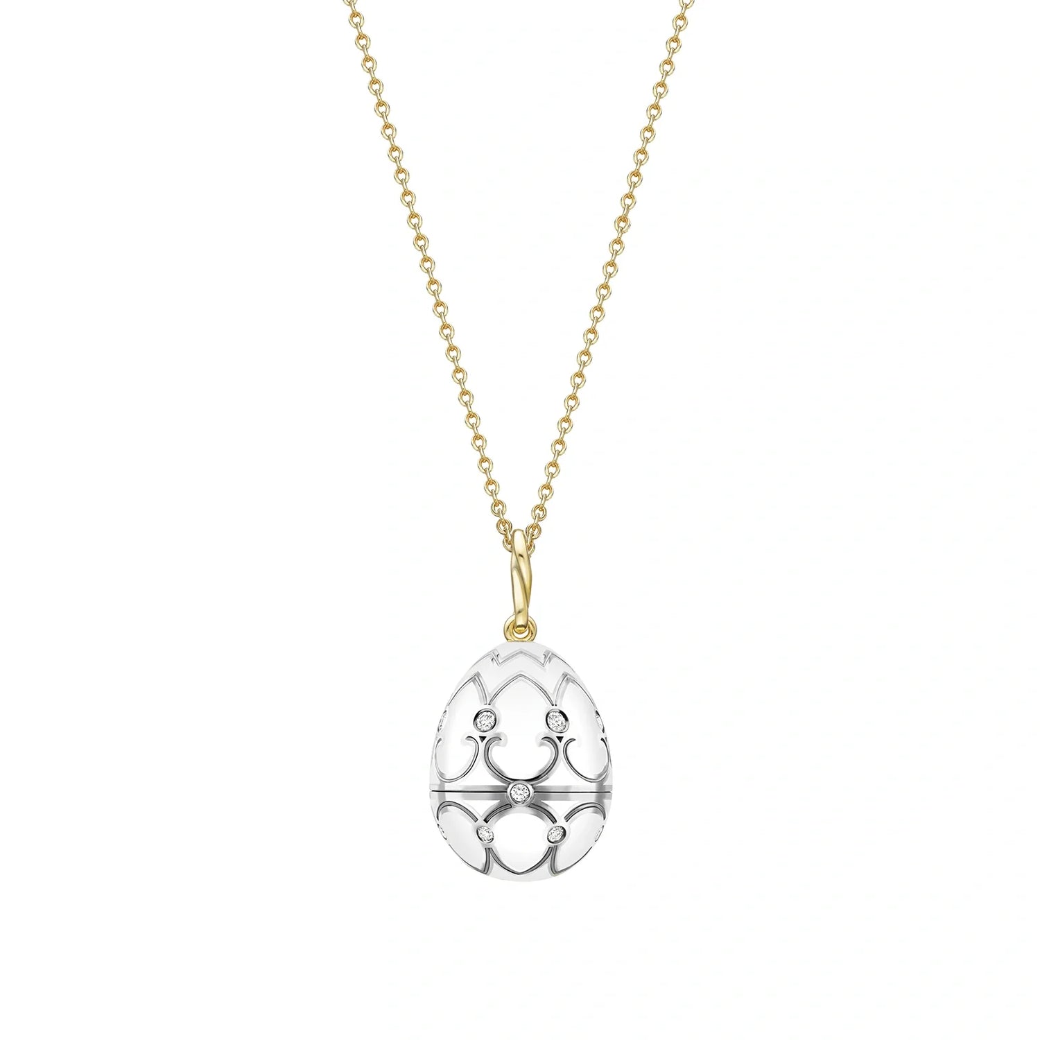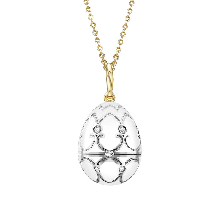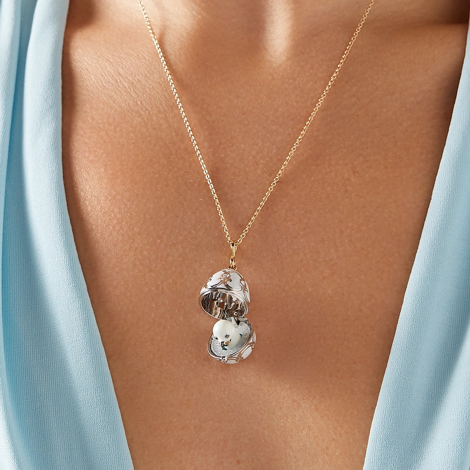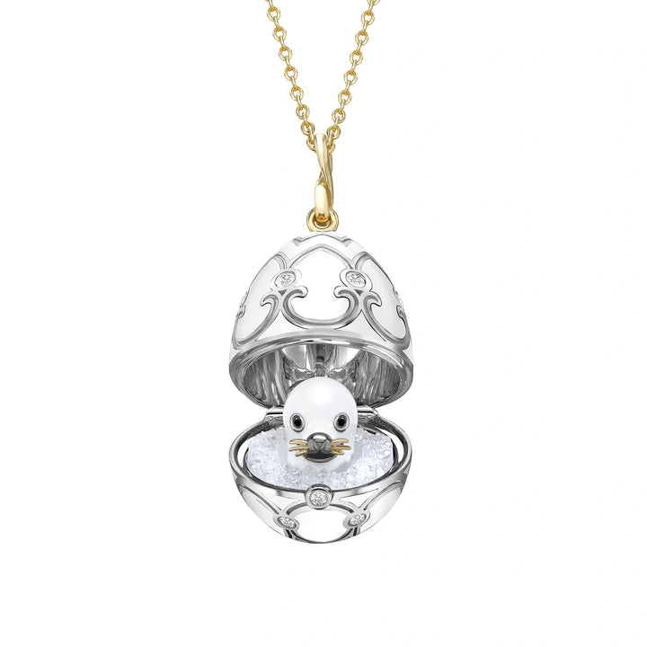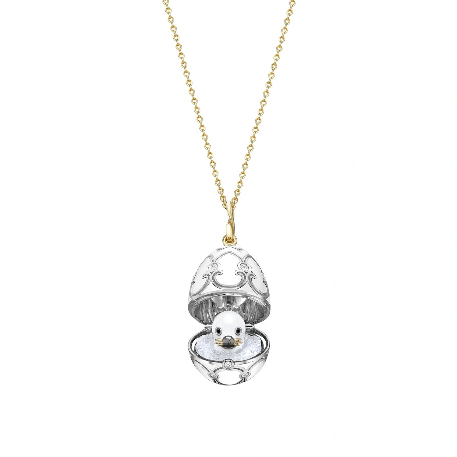 The Heritage Yellow and White Gold Diamond and White Enamel Seal Pup Surprise Locket is a whimsical and elegant piece from Fabergé, featuring 15 round brilliant-cut white diamonds set in an 18k white gold locket. The locket is suspended from an 18k yellow gold bail and chain. Inside, the adorable seal pup, crafted from white lacquer with yellow gold whiskers, peers out from the locket, sitting atop an Amazonian and Silicated Agate platform that mimics freshly fallen snow. This locket embodies Fabergé's tradition of combining quirky, miniature animal designs with precious materials, creating an enchanting blend of artistry and surprise.