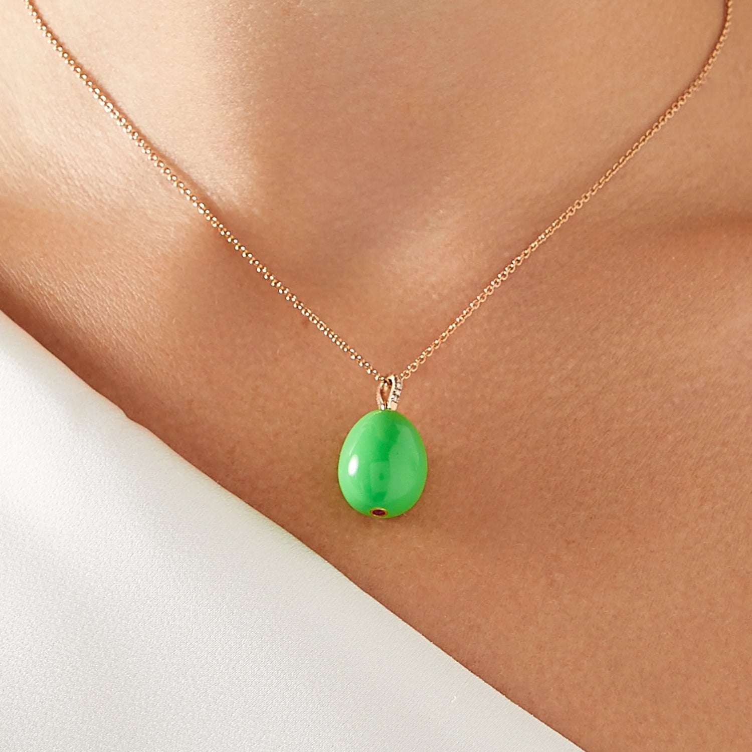 Available in two sizes: 16mm and 18mm. The 16mm pendant features a diamond belt wrapping around the circumference, while the 18mm version features a diamond-set bail. Each pendant includes a Gemfields Mozambican ruby set at the base. Crafted from high-quality metals, the eggs come in five colours. The diamonds are ethically sourced, ensuring sustainability. The rubies are responsibly mined by Gemfields, known for their commitment to transparency and community support through responsible mining practices, and their focus on minimizing environmental impact.