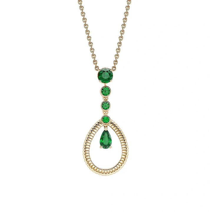 Crafted in 18-karat yellow gold, set with one pear-shaped Zambian emerald and five round-cut emeralds. The pear-shaped emerald drop is 27mm in height. The necklace features a 50cm long 18-karat yellow gold chain.