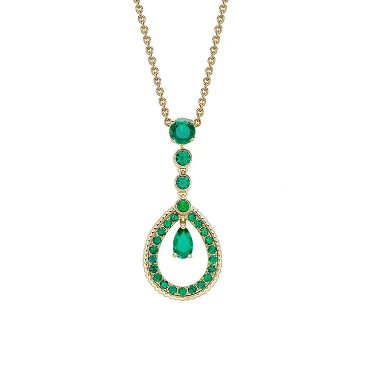 Crafted in 18-karat yellow gold, set with 25 round and 2 pear-shaped emeralds. The pendant drop measures 27mm in height, suspended on a 50cm long yellow gold chain.