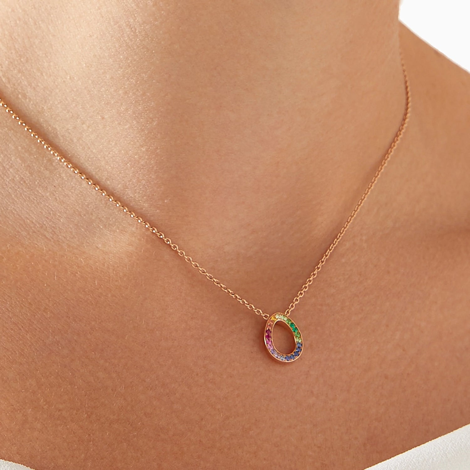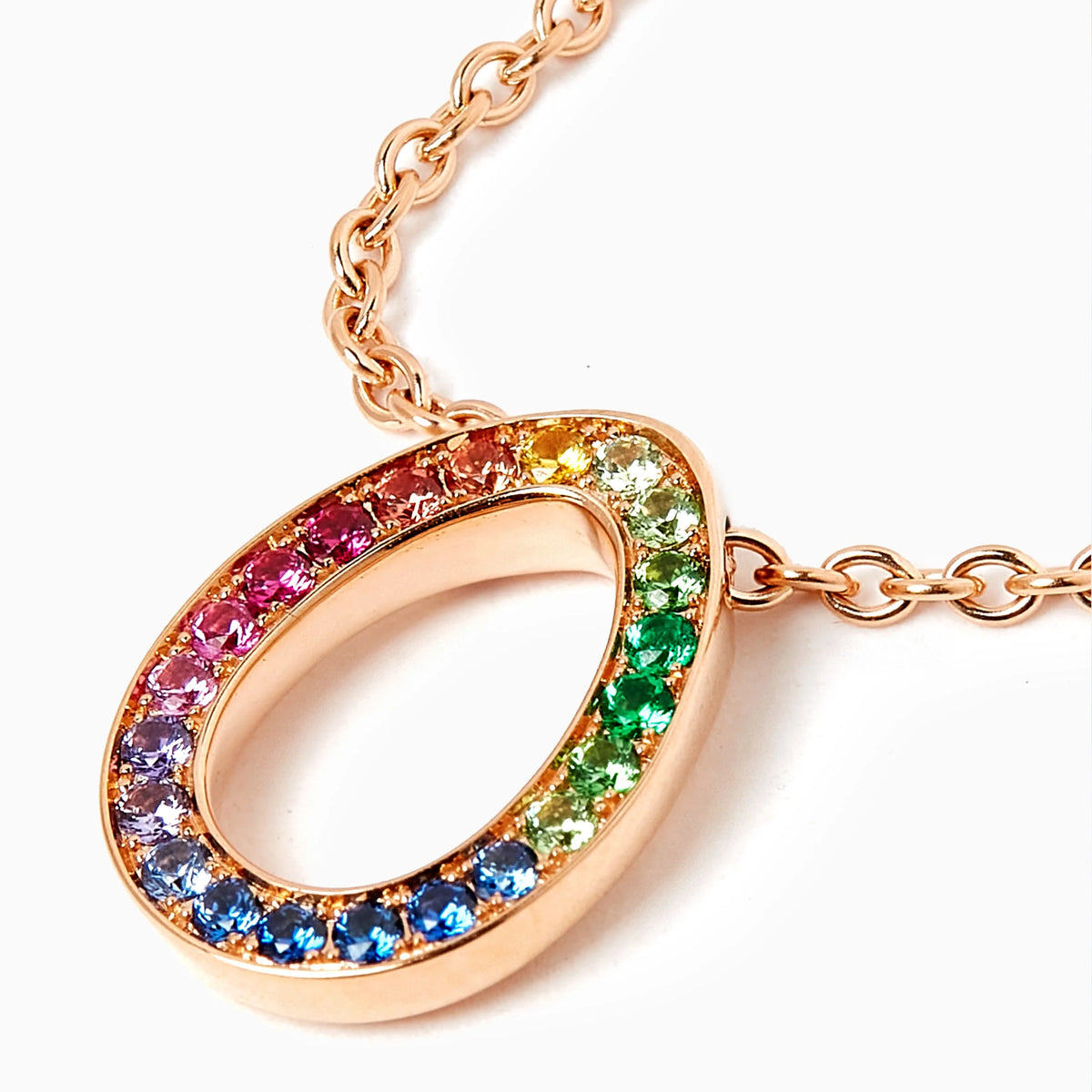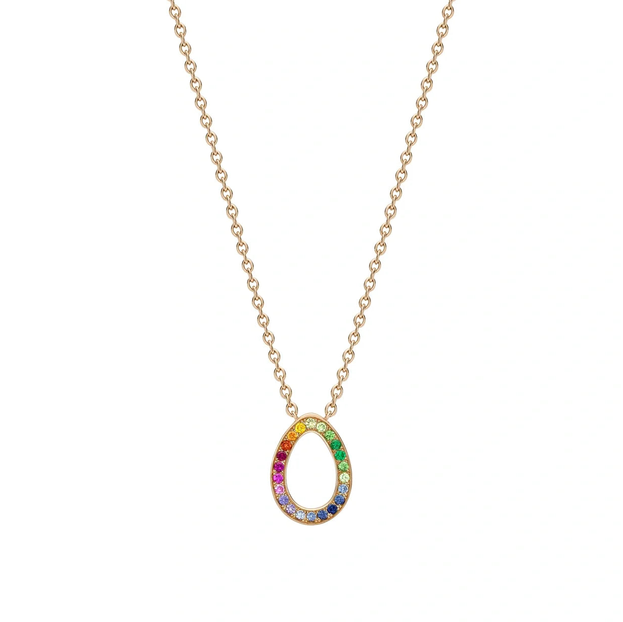 Crafted in 18-karat rose gold, set with pavé multicoloured sapphires, rubies, tsavorites, and garnets. The egg pendant measures 12x9mm, with a 45cm rose gold chain. A hidden Mozambican ruby is set at the back of the egg.