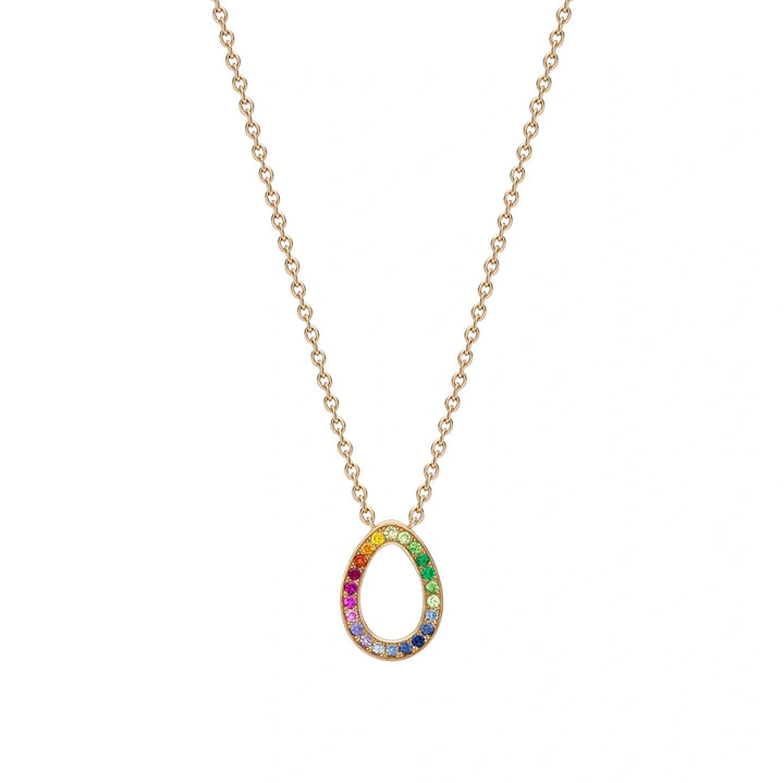 This Colours of Love Sasha Rose Gold Rainbow Multicoloured Gemstone Egg Pendant by Fabergé represents a contemporary interpretation of the iconic egg silhouette, elegantly set with pavé multicoloured gemstones in 18-karat rose gold. The pendant features an array of gemstones, including sapphires, rubies, tsavorites, and garnets, creating a dazzling display of colour. The egg measures 12x9mm and is suspended from a 45cm rose gold chain. In keeping with Fabergé's fondness for delight and surprise, a hidden Mozambican ruby is set at the back of the pendant, adding a touch of secret luxury. This piece is part of the Colours of Love Collection, which celebrates a life in colour through artistic innovation and exceptional craftsmanship.