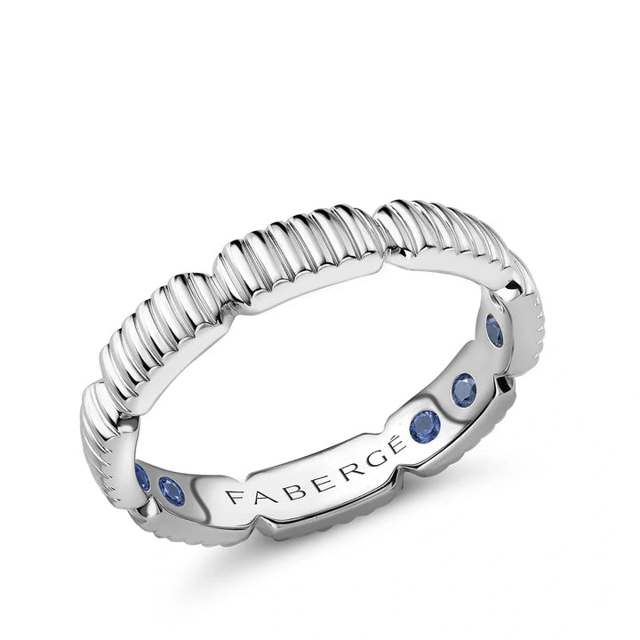 This Colours of Love White Gold Fluted Gemsation Ring with Hidden Blue Sapphires by Fabergé is an elegant and meaningful addition to any collection. Set in 18-karat white gold, the ring features hidden blue sapphires within the band, symbolizing wisdom and calm. Measuring 3.4mm in width, this ring is a perfect blend of beauty and purpose, with sapphires believed to enhance concentration and focus. It is also the birthstone for those born in September. Part of the Colours of Love Collection, this piece celebrates the harmony between extraordinary colored gemstones and sustainable practices.