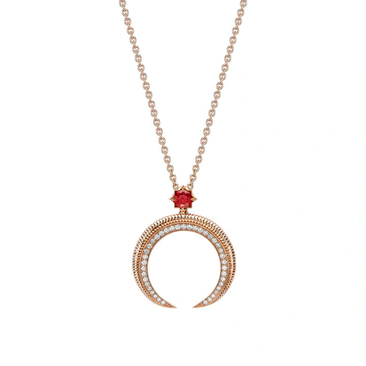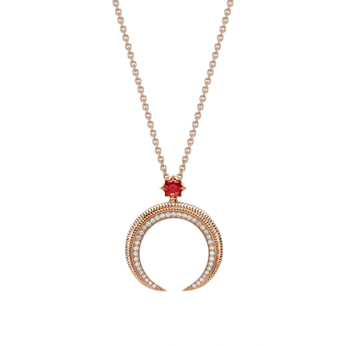 This Colours of Love Crescent Rose Gold Ruby & Diamond Pendant by Fabergé embodies an elegant harmony between precious gemstones and luxurious craftsmanship. Set in 18-karat rose gold, the pendant features a 5mm round ruby nestled within a delicate crescent moon, accented by 39 round brilliant-cut white diamonds. The piece, which measures 34mm in height, is designed to be worn on an adjustable chain (78-85cm). The crescent moon shape evokes a sense of wonder and possibility, making this pendant an exceptional expression of beauty and symbolism. As part of the Hilal collection, it carries the meaning of 'new beginnings,' inspired by the Arabic term for 'crescent moon'.