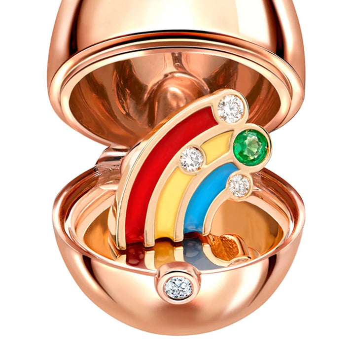 This Fabergé Essence Rose Gold Rainbow Surprise Locket opens at the touch of a diamond button to reveal a hidden lacquered rainbow, a symbol of light after a storm. The vibrant bursts of red, yellow, and blue are accented by three round white diamonds and one round Gemfields emerald. Measuring 18mm, the locket is an artistic representation of Fabergé’s playful love for surprise, wit, and craftsmanship. The Essence collection draws inspiration from the iconic Imperial Eggs, with a modern twist that incorporates diamonds and coloured gemstones.