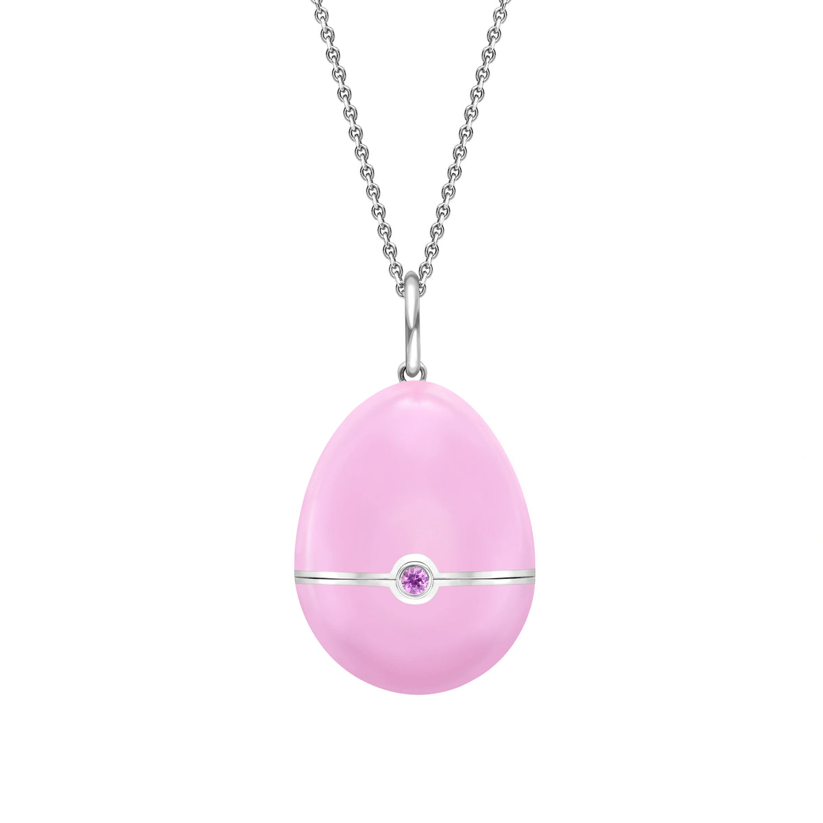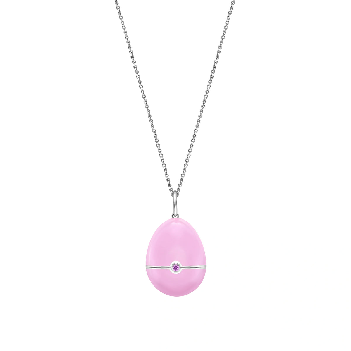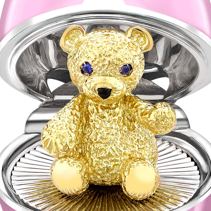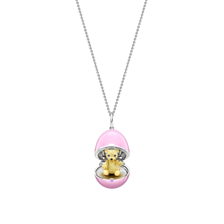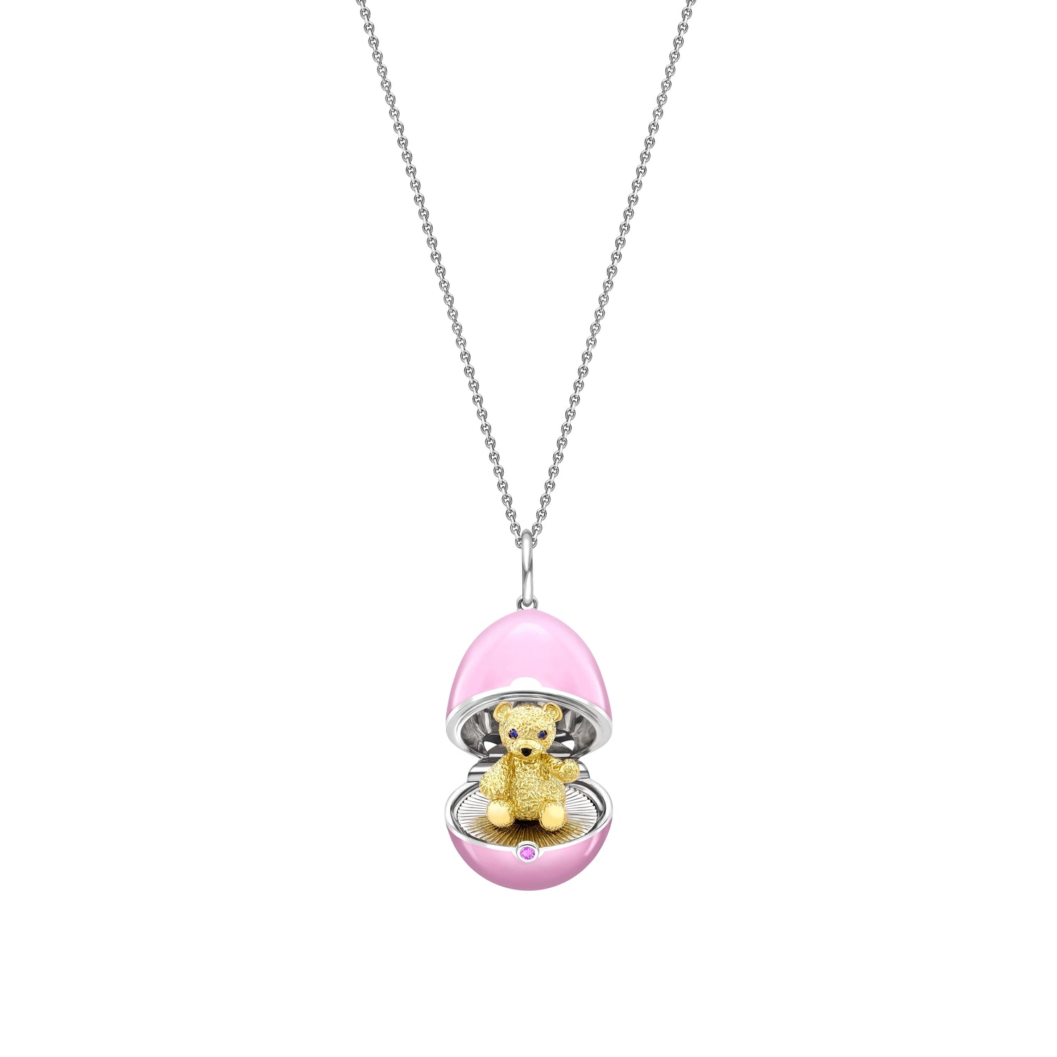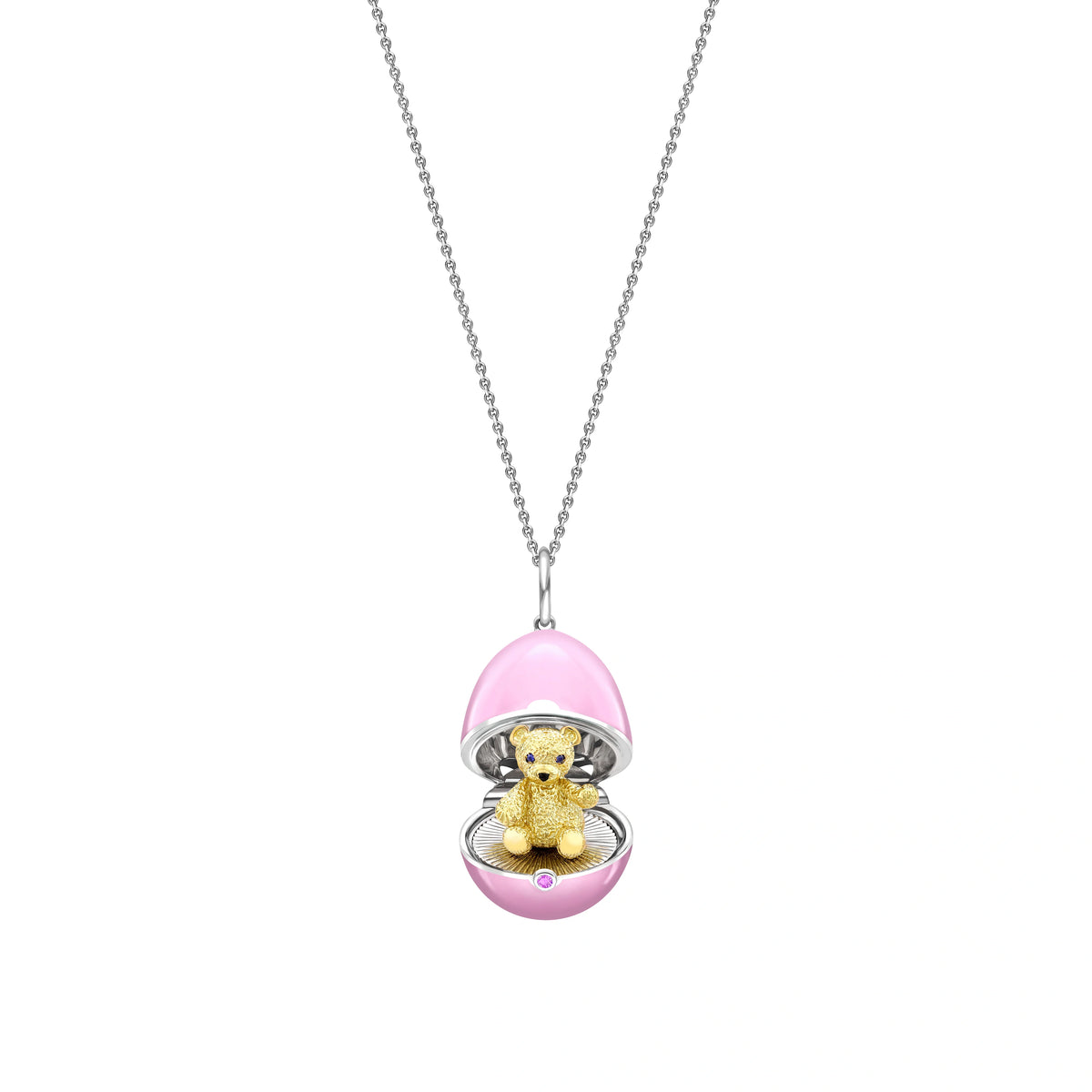 This Fabergé Essence White Gold, Yellow Gold & Sapphire Teddy Surprise Locket with Pink Lacquer is a charming and playful piece, designed to celebrate new life. The locket is crafted from 18-karat yellow gold and hand-painted in a soft baby pink lacquer. Adorned with two blue sapphires and one pink sapphire, this piece evokes warmth, joy, and the special moments surrounding a birth. Inspired by Fabergé's iconic Imperial Eggs, it combines whimsy with precious gems, making it a heartfelt gift for a newborn or a significant life milestone.