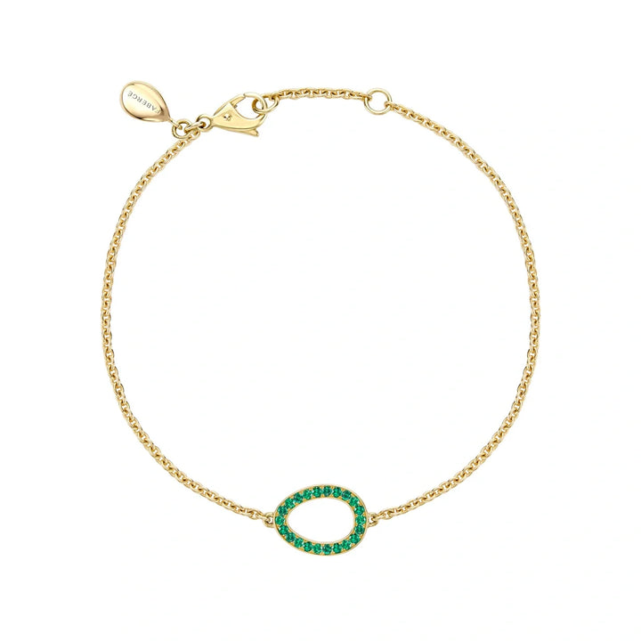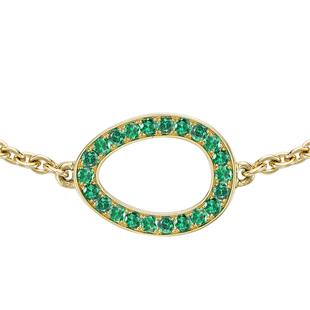 This Colours of Love Sasha Yellow Gold Emerald Egg Chain Bracelet by Fabergé features a stunning 12x9mm emerald egg, set with 22 pavé-set round Zambian emeralds. The luxurious egg design is crafted in 18-karat yellow gold, complemented by a delicate 1.5mm wide yellow gold trace chain, measuring 17.5cm in length, with the option to adjust for a more tailored fit. A hidden Mozambican ruby is nestled at the back of the egg, in keeping with Fabergé’s signature element of surprise. This bracelet combines timeless elegance with playful surprise, making it a perfect symbol of nature and beauty.