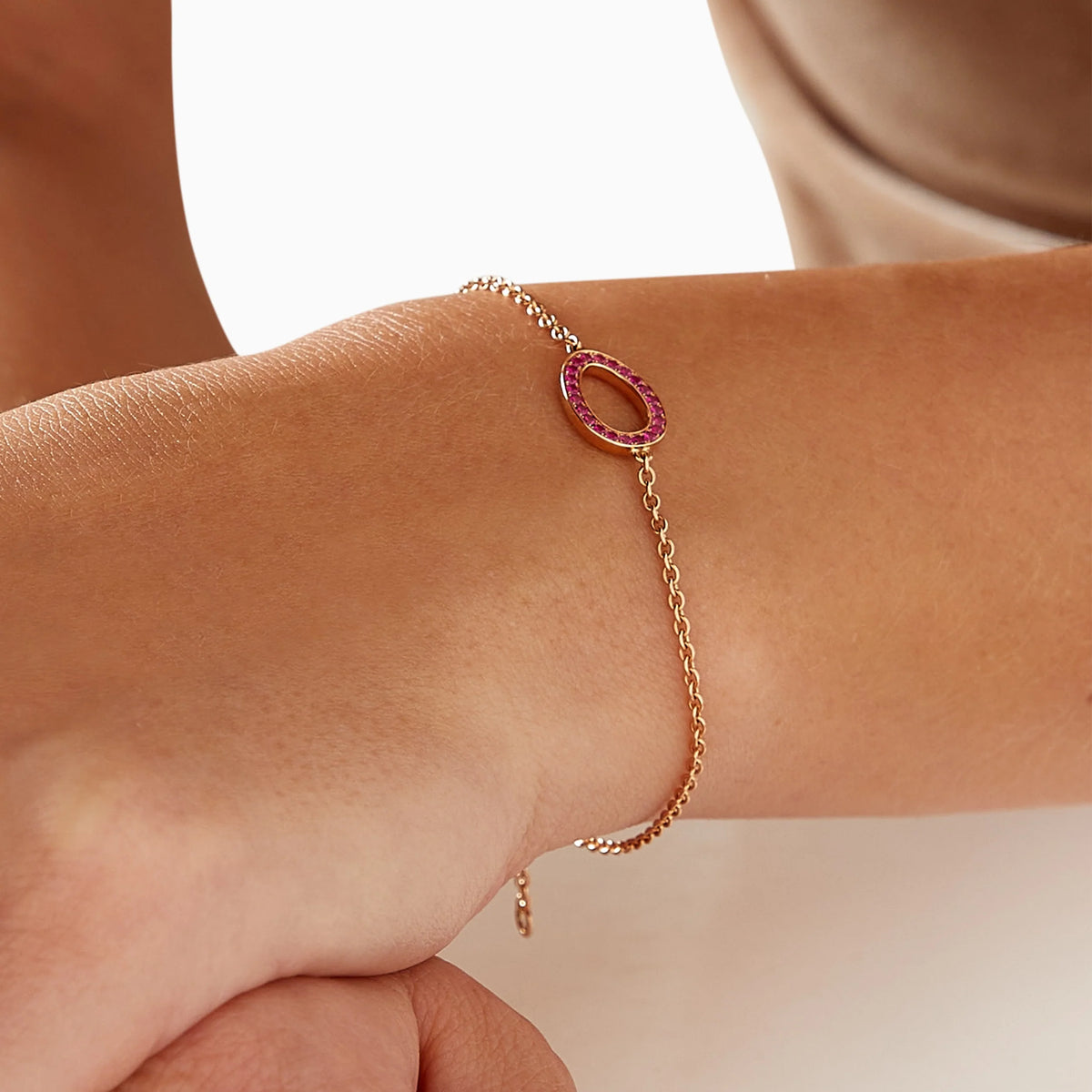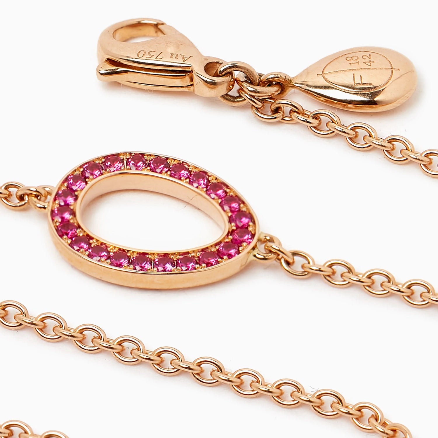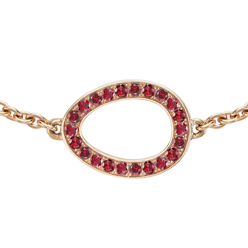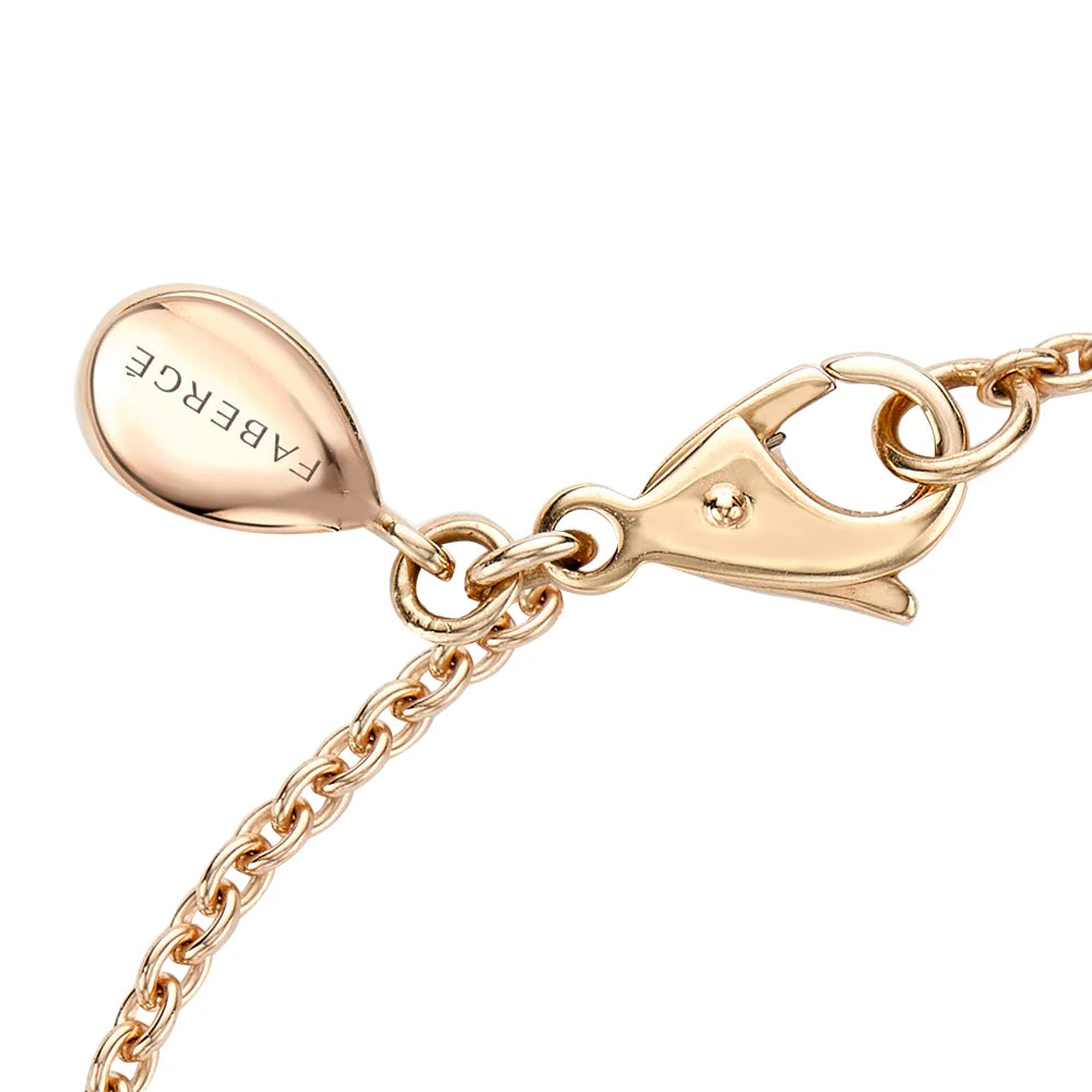 This Colours of Love Sasha Rose Gold Ruby Egg Chain Bracelet by Fabergé features a captivating 12x9mm ruby egg, adorned with 22 pavé-set round Mozambican rubies. Set in warm 18-karat rose gold, the bracelet is strung on a delicate 1.5mm wide trace chain, 17.5cm long, with an adjustable length to allow a perfect fit. As with all Fabergé pieces, a hidden Mozambican ruby is tucked at the back of the egg, adding an extra element of surprise. The rich red hues of the rubies, combined with the luxurious rose gold, create a truly stunning statement of love and passion.