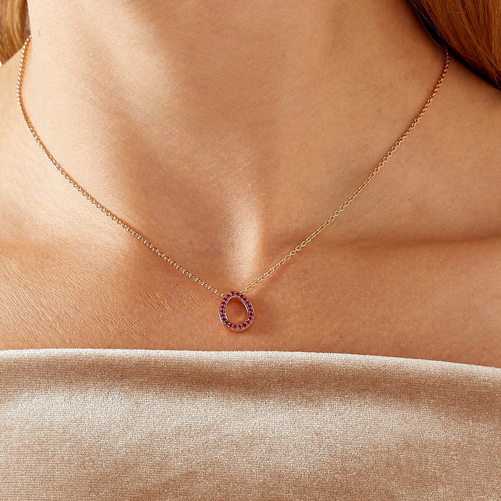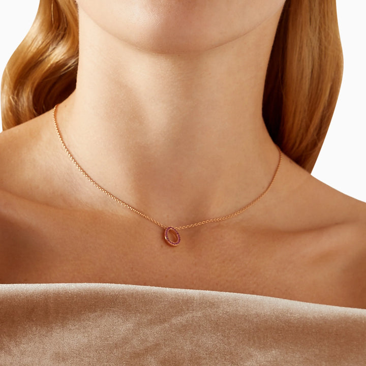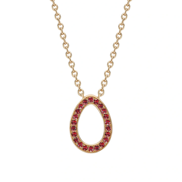 This Colours of Love Sasha Rose Gold Ruby Egg Pendant by Fabergé features a stunning 12x9mm ruby egg, adorned with 23 pavé-set Mozambican rubies. The pendant is set in luxurious 18-karat rose gold, and the design is completed with a 45cm chain. A hidden Mozambican ruby can also be found at the back of the pendant, adding a delightful surprise. The design is a modern take on the iconic egg silhouette, symbolizing love, passion, and the hidden beauty of life. This pendant makes a timeless and meaningful statement.
