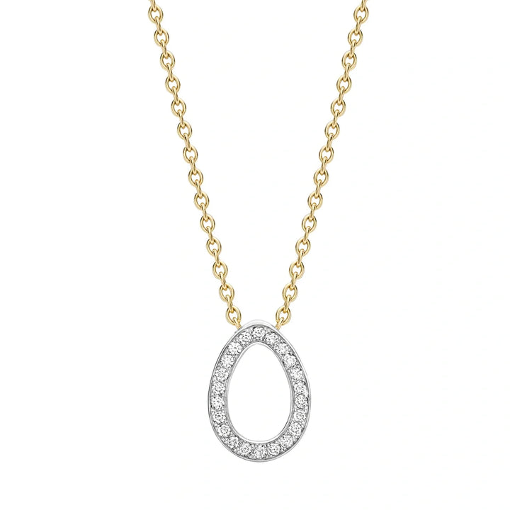 This Colours of Love Sasha Yellow & White Gold Diamond Egg Pendant by Fabergé features a luxurious 12x9mm diamond egg, set with 22 pavé-set round brilliant-cut white diamonds in 18-karat white gold. The pendant is suspended from a sleek 45cm yellow gold chain, with the egg resting delicately in 18-karat white gold. As always with Fabergé, a hidden Mozambican ruby is revealed at the back of the egg, adding a sense of personal delight. This pendant epitomizes refined elegance, perfect for layering or wearing solo as a statement piece.