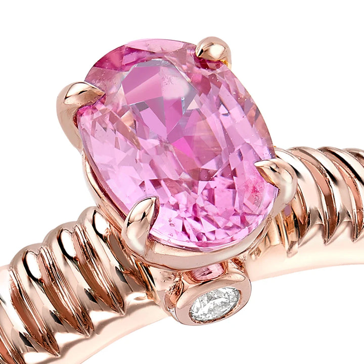 18-karat fluted rose gold, featuring an oval 6x4mm pink sapphire center gemstone. Hidden Mozambican ruby inside the band. Shank width: 2.7mm, depth: 2mm.