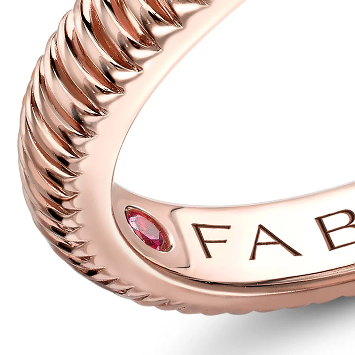Colours of Love Rose Gold Pink Sapphire Fluted Ring features an oval 6x4mm pink sapphire center gemstone, set in 18 karat fluted rose gold. A hidden Mozambican ruby is concealed on the inside of the band, embodying Fabergé’s delight and surprise. The shank measures 2.7mm in width and 2mm in depth, offering an elegant yet substantial fit.