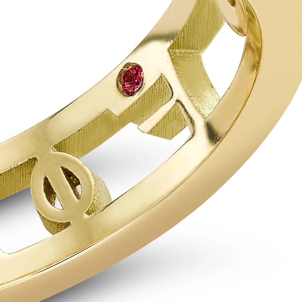 Set in polished 18-karat yellow gold with two round brilliant diamonds. The band width is 5mm, with a depth of 2mm. A hidden round-cut ruby is concealed within the design.