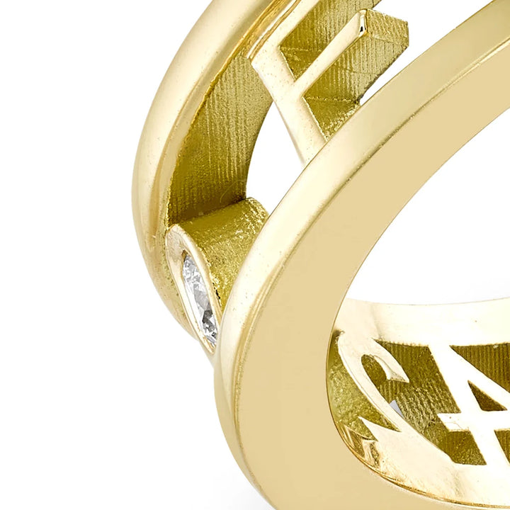 This Fabergé 1842 Yellow Gold & Diamond Signature Ring is a bold and elegant piece, featuring the iconic Fabergé hallmark set in polished 18-karat yellow gold. Adorned with two round brilliant diamonds, the ring’s sleek design is further enhanced by a hidden round-cut ruby, staying true to Fabergé's penchant for surprise. The ruby symbolizes passion, prosperity, and protection, adding a secret layer of meaning to the design. The clean, modern aesthetic of the ring makes it a timeless piece, while the hidden ruby offers a personal touch that is uniquely Fabergé.