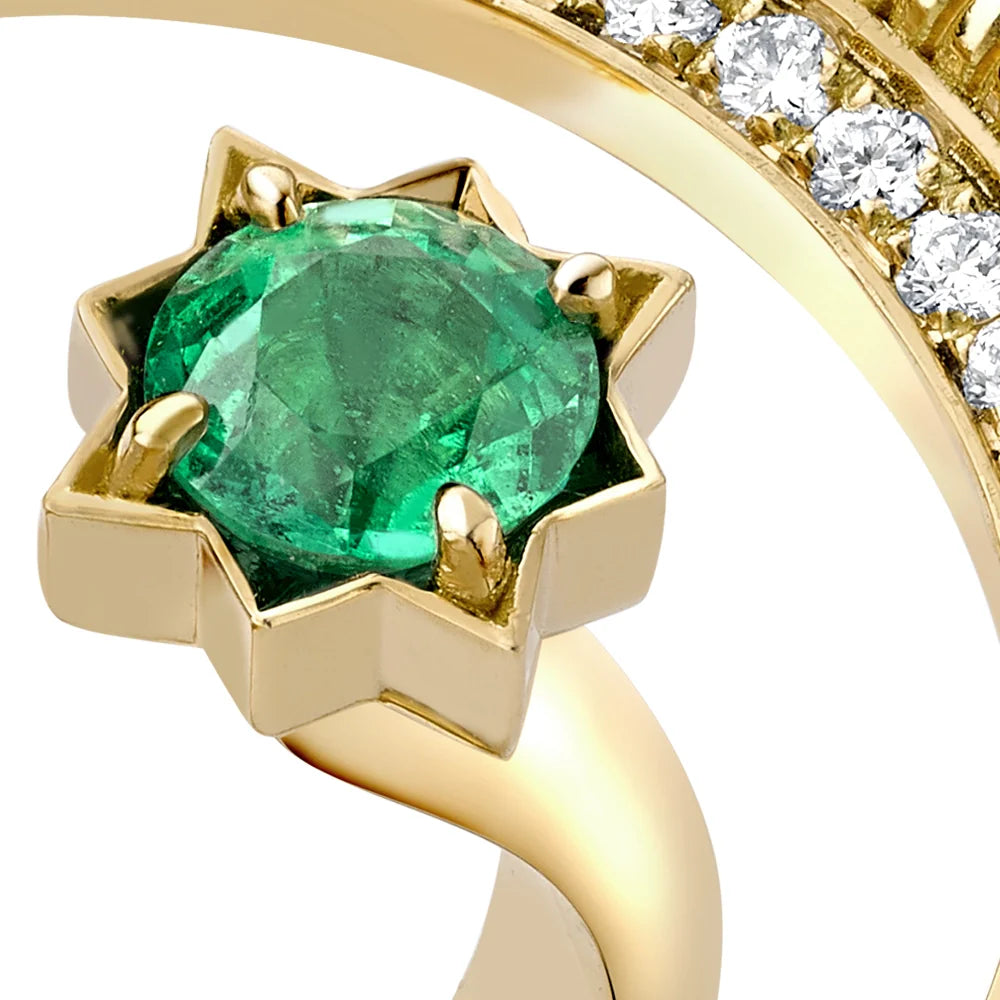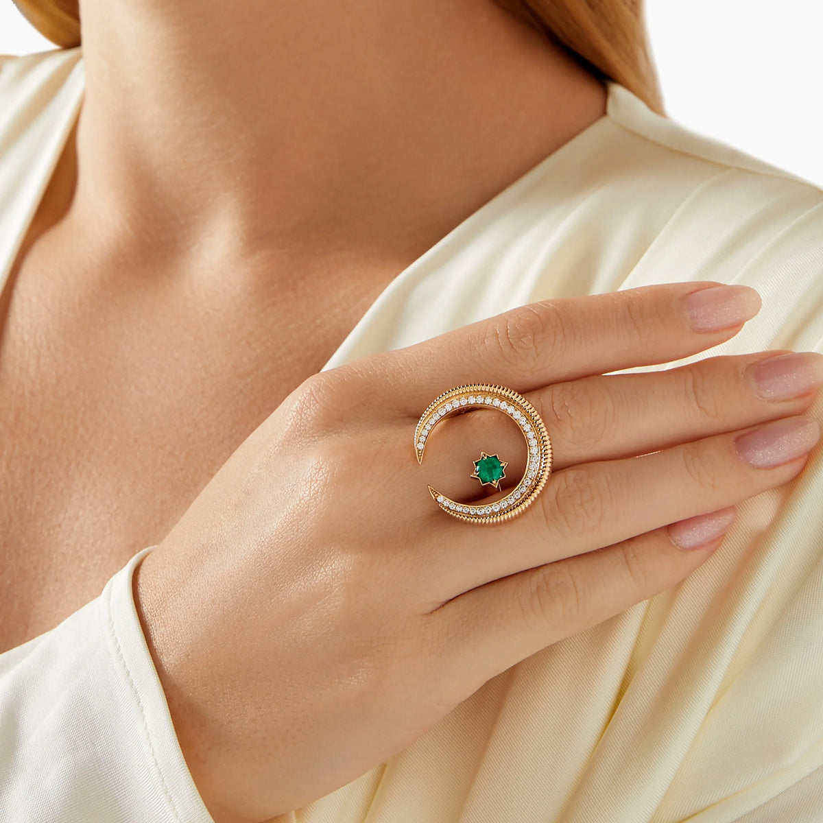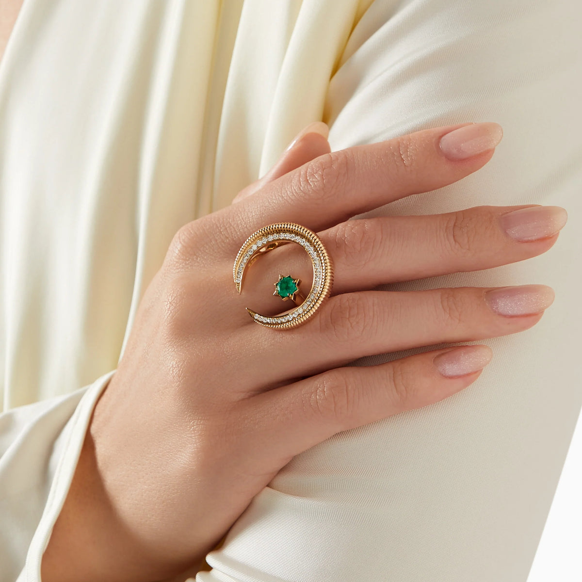 Materials: Crafted from 18k yellow gold with diamond pave detailing and a Zambian emerald star. The pendant's crescent measures 26mm in length, and the ring shank is 3.5mm in width.