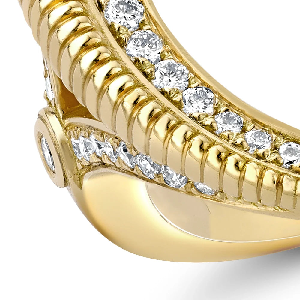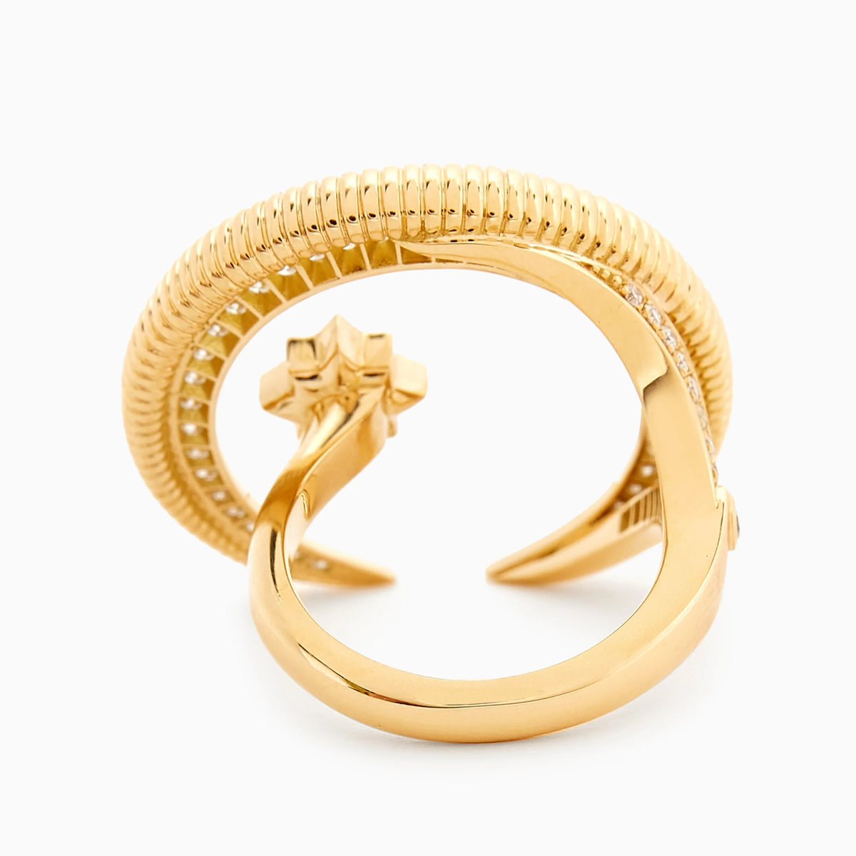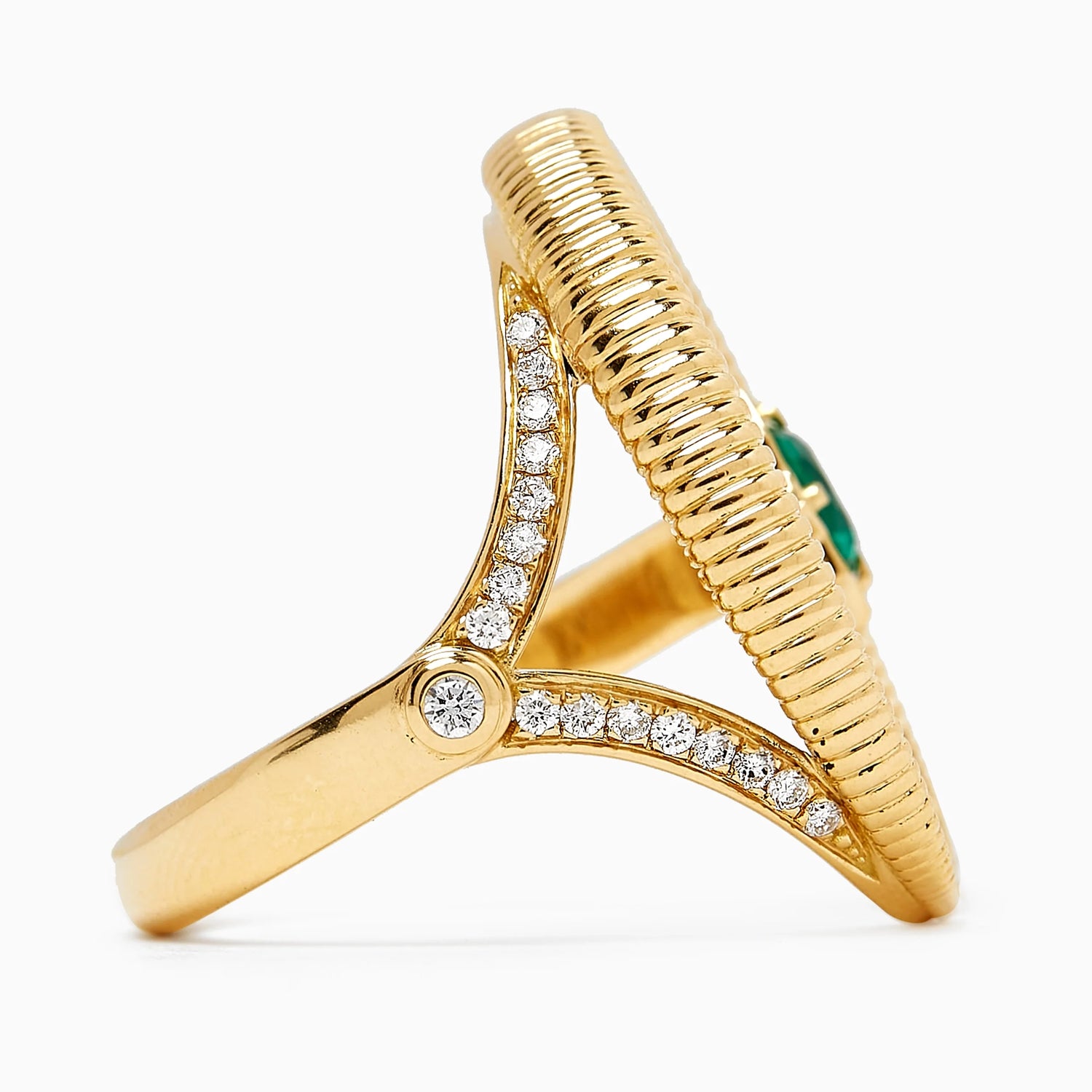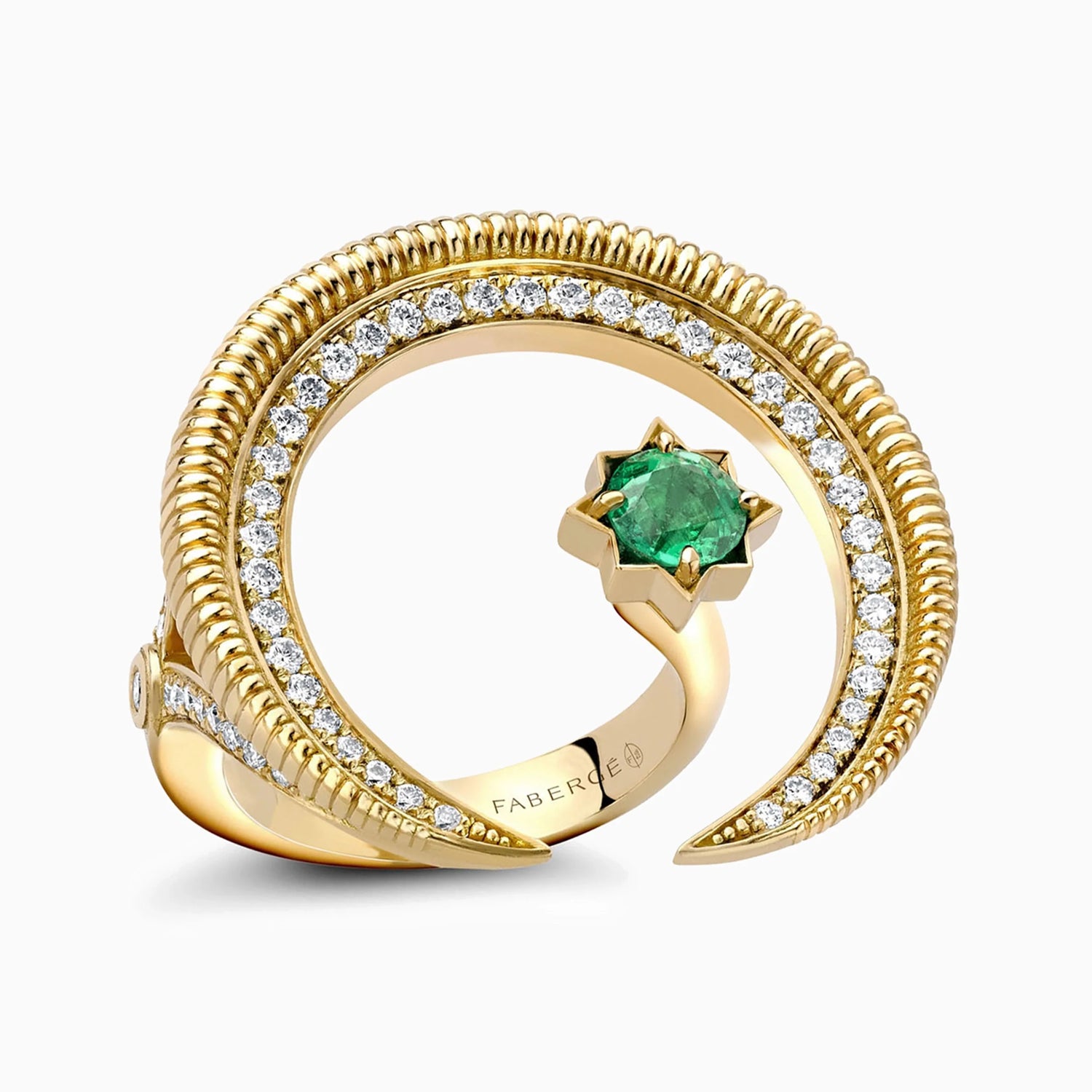 Style Notes: These Hilal Crescent Pendant and Earrings by Fabergé embody the brand’s dedication to exceptional craftsmanship and artistic creativity. Inspired by the crescent moon, each piece features delicately fluted 18k yellow gold, enhanced by diamond pave detailing. A sparkling emerald star nestles within the curve of the crescent, offering a striking contrast against the gold. The pieces evoke elegance and mysticism, making them ideal for those seeking a unique, yet timeless statement. The Hilal Crescent collection is named after the Arabic word for crescent moon, emphasizing its celestial beauty.