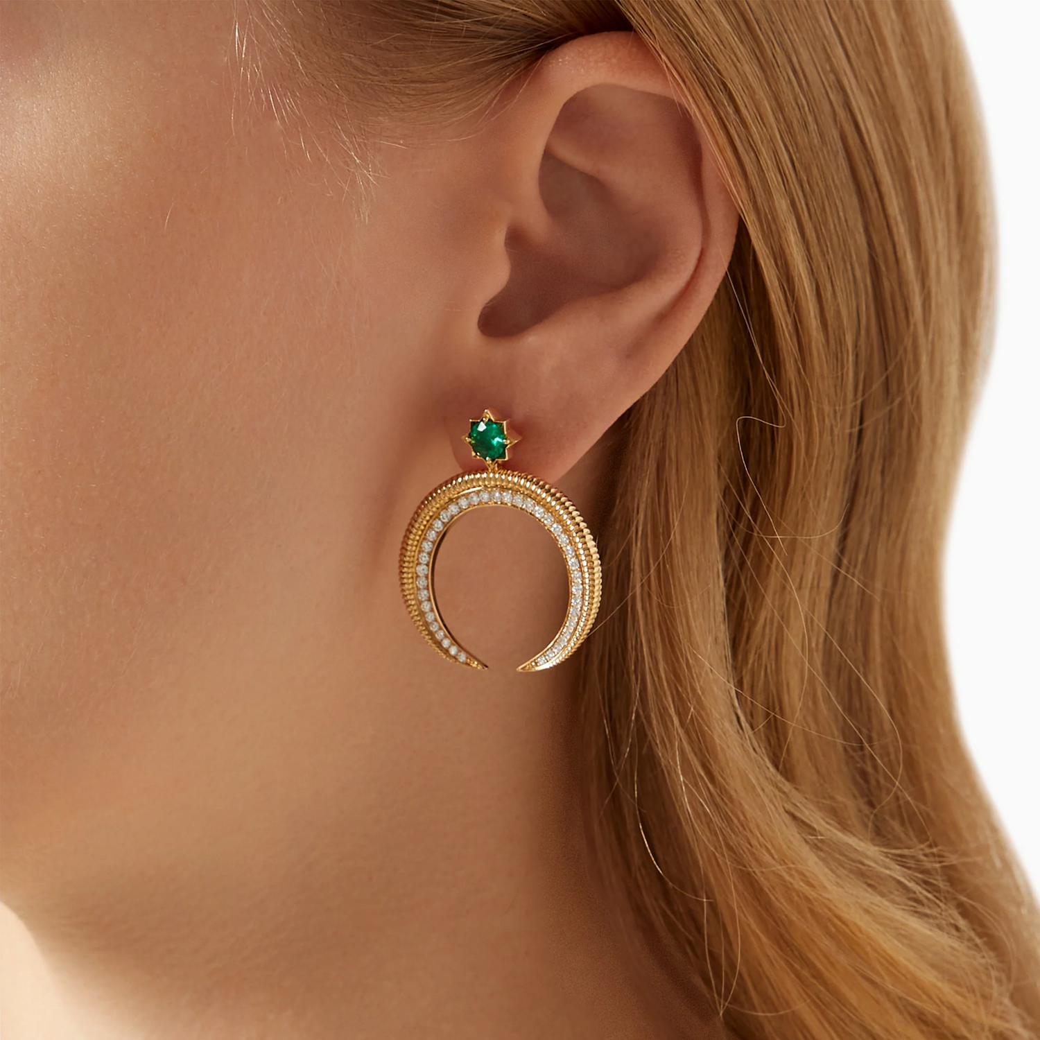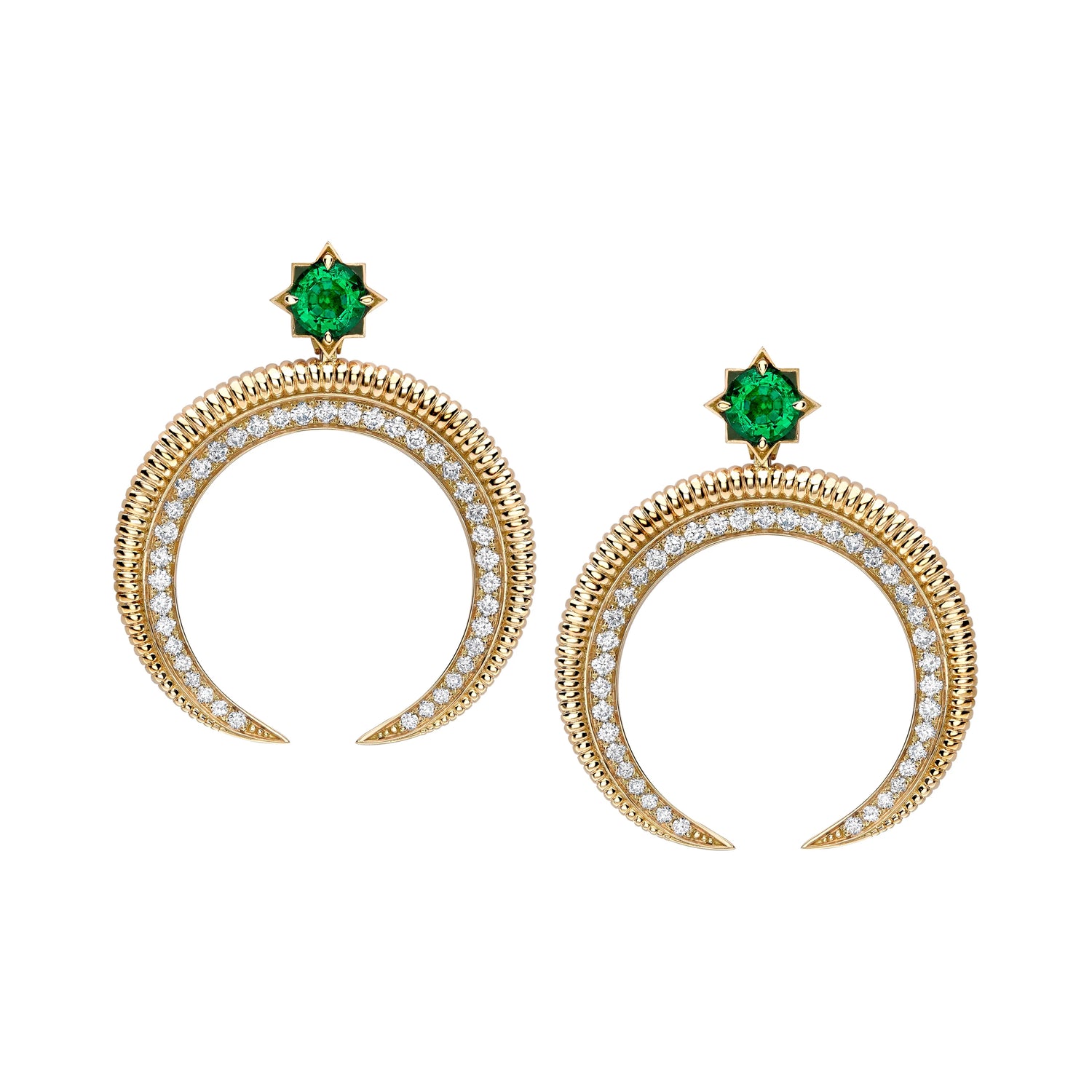 These Hilal Crescent Earrings by Fabergé are a true testament to the brand’s commitment to exquisite craftsmanship and sophisticated design. Inspired by the crescent moon, each earring is made of elegantly fluted 18k yellow gold, with a line of diamond pave accentuating the curved shape. A vibrant emerald star rests within the arms of the crescent, adding a touch of color and mystique. The name 'Hilal,' meaning 'crescent moon' in Arabic, perfectly captures the celestial beauty of these earrings. At 35mm in height, they make a bold yet refined statement, perfect for evening wear or adding a unique element to your jewelry collection.