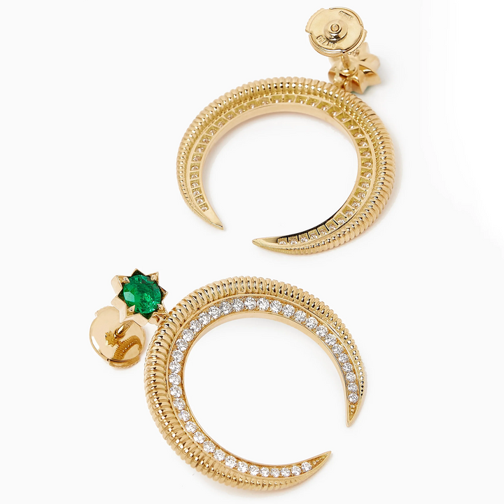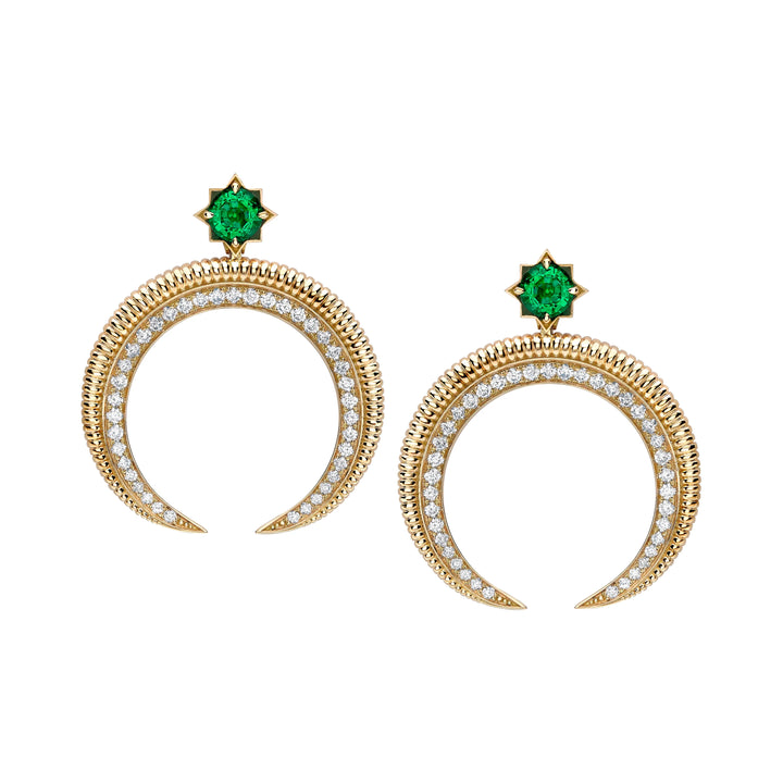 Crafted from 18k yellow gold with diamond pave detailing and Zambian emerald stars. Each earring measures 35mm in height.