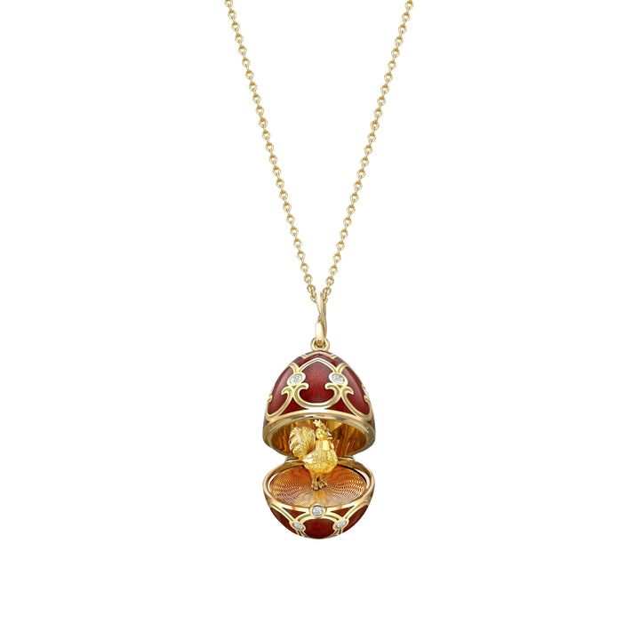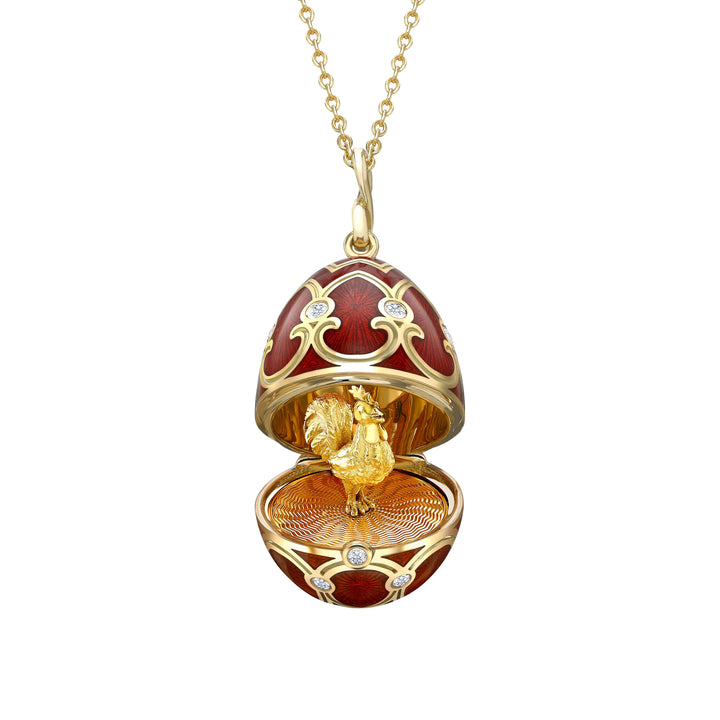The Heritage Yellow Gold Diamond & Red Guilloché Enamel Year of the Rooster Surprise Locket from Fabergé captures the essence of artistry and tradition. Inspired by the Chinese Zodiac, the locket features delicate red guilloché enamel and round white diamonds, all set in 18k yellow gold. Opening the locket reveals a meticulously crafted rooster in 18k yellow gold, with diamond-set eyes, symbolizing the Year of the Rooster. This collectible piece from the Heritage collection combines rich color, intricate craftsmanship, and a meaningful cultural reference, making it a timeless and personalized treasure.