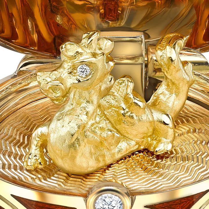The Heritage Yellow Gold Diamond & Red Guilloché Enamel Year of the Dragon Surprise Locket honors the Chinese Year of the Dragon, a symbol of good luck, strength, and health. This beautifully crafted locket, set in 18k yellow gold, features red guilloché enamel and white diamonds, with the locket opening to reveal a dragon in 18k yellow gold, complete with diamond eyes. The dragon’s intricate design captures the mysticism and power associated with this legendary creature. A 22mm locket, paired with an 18k yellow gold chain, this piece exemplifies Fabergé's mastery of the guilloché enamel technique and hand-engraving.