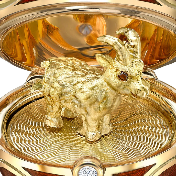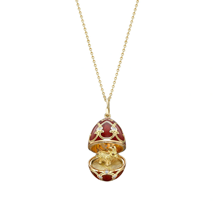 The Heritage Yellow Gold Diamond & Red Guilloché Enamel Year of the Goat Surprise Locket is a captivating tribute to the Chinese Year of the Goat, representing peace, harmony, and creativity. Set in 18k yellow gold, the locket features red guilloché enamel and white diamonds. When opened, it reveals an intricately designed 18k yellow gold goat with ruby-set eyes. This 22mm locket, suspended on an 18k yellow gold chain, combines traditional Chinese symbolism with Fabergé’s signature craftsmanship, creating a timeless and luxurious piece.