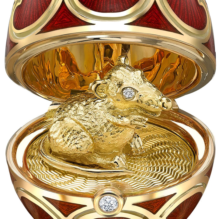 This Heritage Yellow Gold Diamond & Red Guilloché Enamel Year of the Rat Surprise Locket by Fabergé commemorates the Chinese Year of the Rat with the combination of vibrant red guilloché enamel and white diamonds, set in luxurious 18-karat yellow gold. Inside the 22mm locket, a hidden gold rat symbolizes wealth, resourcefulness, and kindness—qualities associated with the Year of the Rat. This intricate piece not only celebrates the zodiac but also embodies Fabergé’s commitment to craftsmanship and the art of surprise. It’s perfect for those born in the Years of the Rat (1924, 1936, 1948, 1960, 1972, 1984, 1996, 2008, 2020).