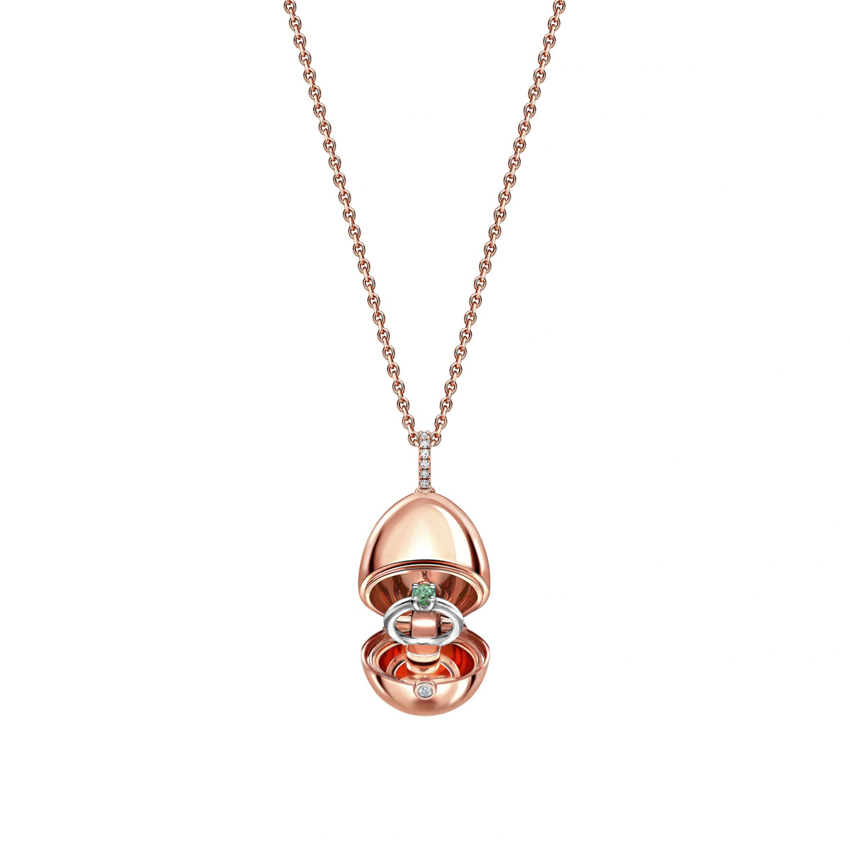 This Fabergé Essence Rose Gold Emerald Ring Surprise Locket blends elegance with surprise, offering a modern take on classic luxury. Set in 18-karat rose gold, the 18mm locket opens to reveal a stunning emerald ring, featuring a rich Zambian emerald at its center. The vibrant green gemstone evokes feelings of growth, renewal, and vitality, adding a touch of enchantment to this delicate piece. Part of the Essence collection, this locket is inspired by the iconic Imperial Eggs, showcasing Fabergé's mastery of design while incorporating modern touches of colored gemstones. It’s the perfect balance of sophistication, wit, and surprise.