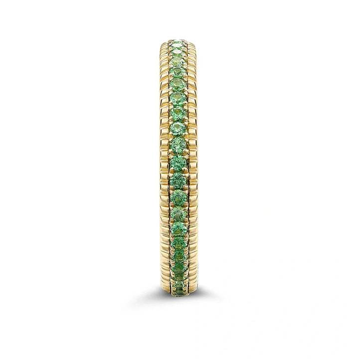 This Colours of Love Yellow Gold Tsavorite Fluted Eternity Ring by Fabergé is a true testament to the brand’s dedication to both artistry and innovation. Featuring a band of 18-karat fluted yellow gold, the ring is adorned with round tsavorites, each stone set to enhance the rich, vibrant green hue. A hidden ruby is concealed on the inner side of the band, adding an element of surprise and discovery, in keeping with Fabergé’s whimsical charm. The perfect embodiment of luxury, surprise, and color, this ring celebrates the beauty of nature through the striking combination of gemstones.