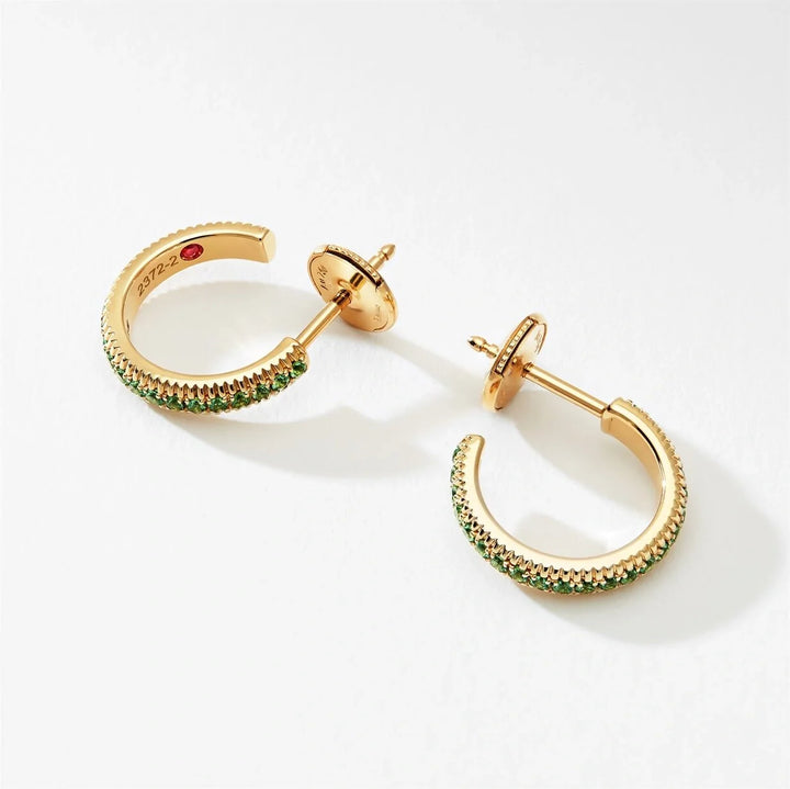 These Colours of Love Yellow Gold Tsavorite Fluted Hoop Earrings by Fabergé bring vibrant color and intricate design to life with their harmonious blend of gemstones and gold. Handcrafted in 18-karat yellow gold, the earrings feature 46 round tsavorites and two round Mozambican rubies. Their 15mm diameter creates an elegant and bold presence, while the rich green of the tsavorites and the fiery red rubies offer a striking contrast. Part of the Colours of Love collection, these earrings reflect Fabergé’s commitment to exceptional craftsmanship and artistic ingenuity.