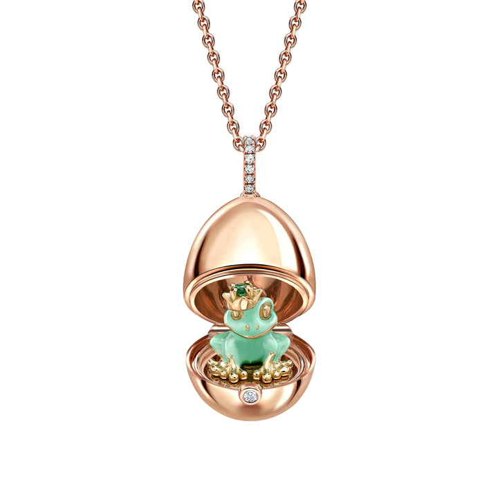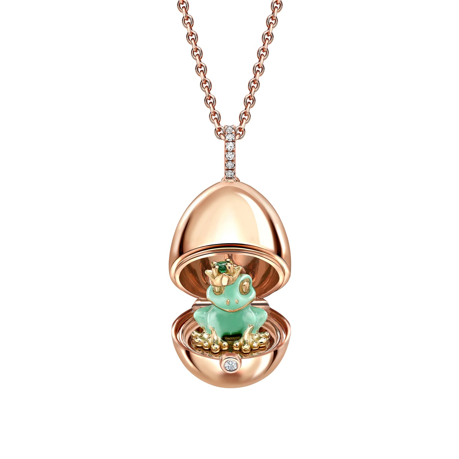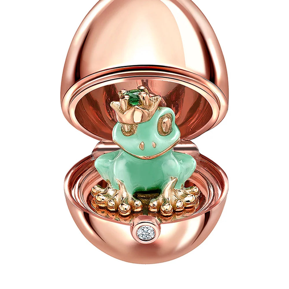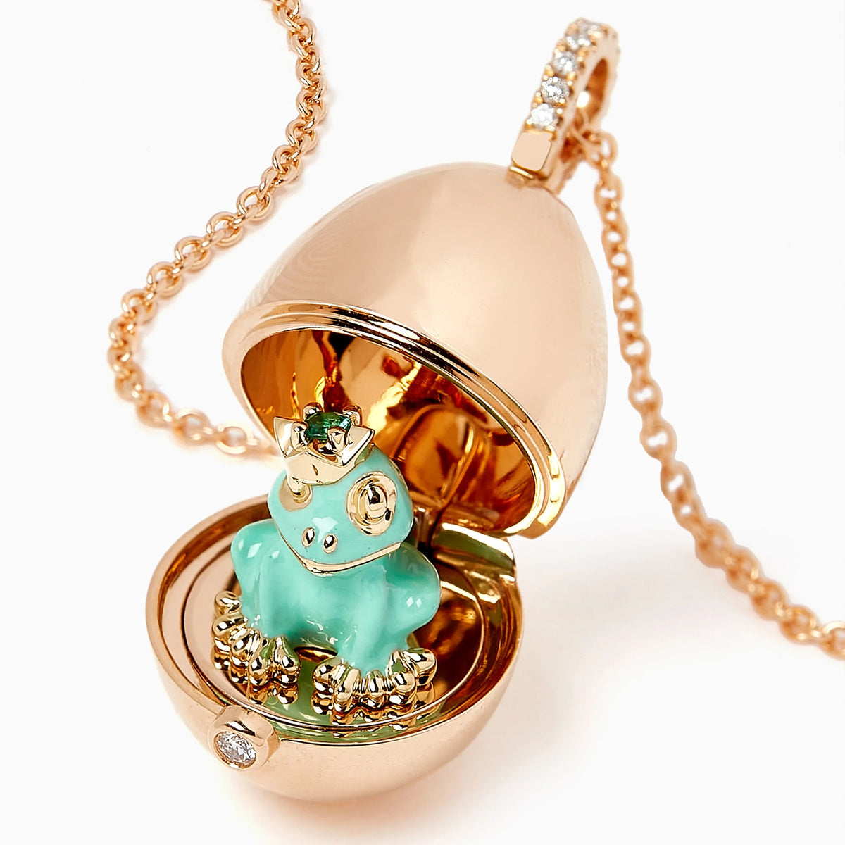 This Fabergé Essence Rose Gold & Green Lacquer Frog Surprise Locket is an enchanting blend of whimsy and luxury. Set in 18-karat rose gold, the locket opens to reveal a delightful green lacquer frog, with a Zambian emerald set in its crown. The 18mm locket size offers an intimate yet striking presence, while the clever surprise element adds a playful twist to the refined design. A perfect representation of Fabergé’s mastery in blending surprise and elegance, this locket is a modern take on the iconic Imperial Eggs, reimagined with colorful gemstones and a sense of wonder.