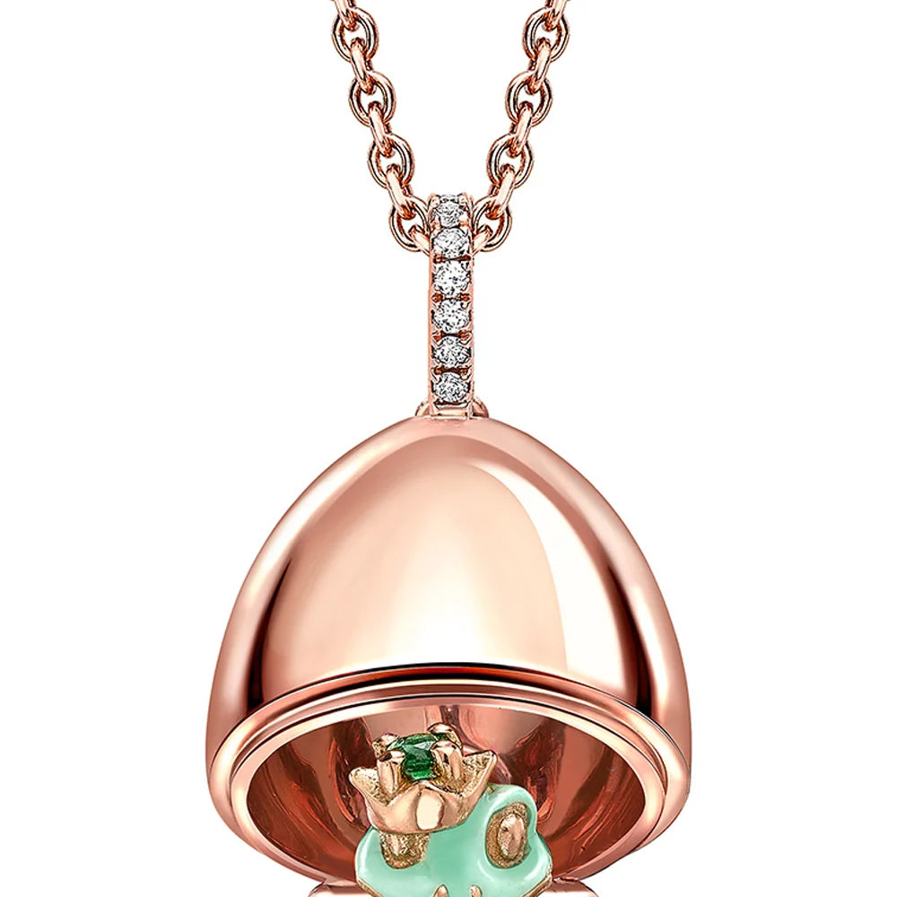 Handcrafted in 18-karat rose gold with green lacquer and one Zambian emerald in the frog’s crown. The locket measures 18mm in size.