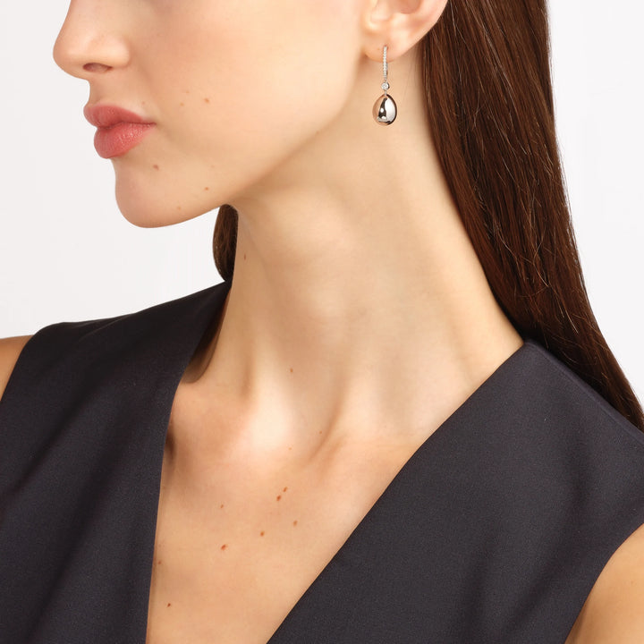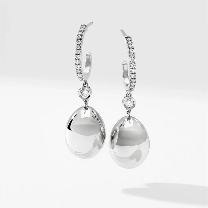 These Fabergé Essence White Gold Diamond Set Egg Drop Earrings are an elegant interpretation of the brand’s iconic Imperial Eggs, reimagined with a contemporary twist. Set in 18-karat white gold, these earrings feature round white diamonds and are designed in the shape of delicate eggs measuring 14mm. Perfect for those who appreciate subtle luxury, these earrings embody Fabergé’s love for surprise and wit, while celebrating the timeless art of jewelry craftsmanship.
