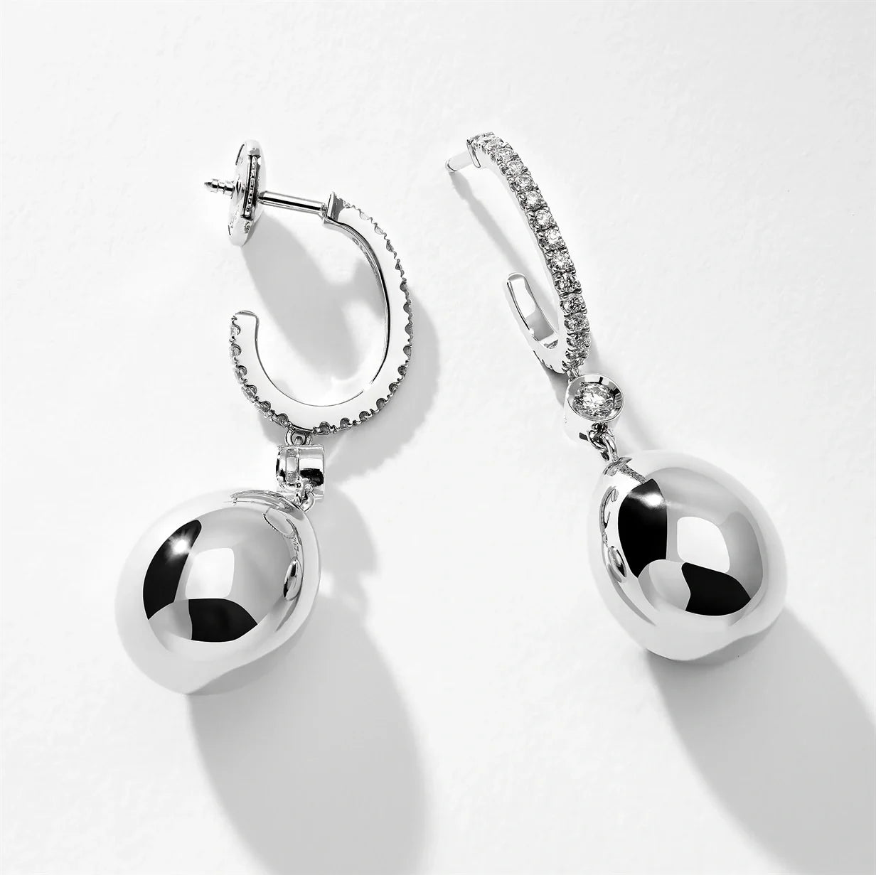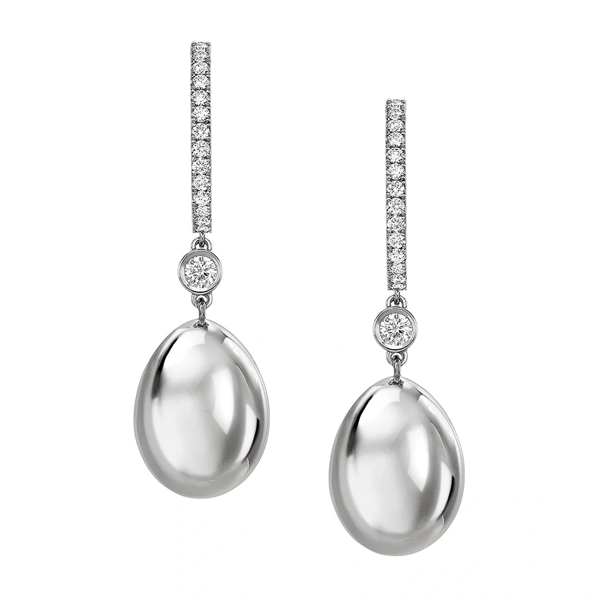 Handcrafted in 18-karat white gold with round white diamonds. The eggs measure 14mm in size.