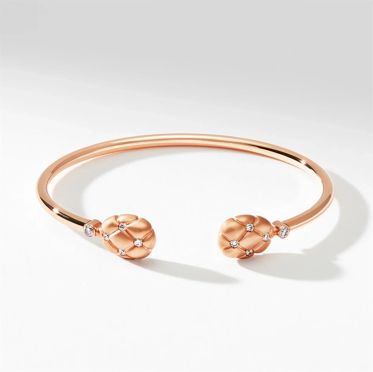 The Treillage Brushed Rose Gold & Diamond Open Set Bracelet is an exquisite piece inspired by Fabergé’s 1892 Diamond Trellis Egg. This bracelet features brilliant-cut round white diamonds and two quilted Fabergé eggs set in 18-karat brushed rose gold, creating a perfect blend of heritage and modern design. As with all Fabergé pieces, it contains a hidden ruby inside the bracelet, symbolizing the special bond between the wearer and their loved ones.