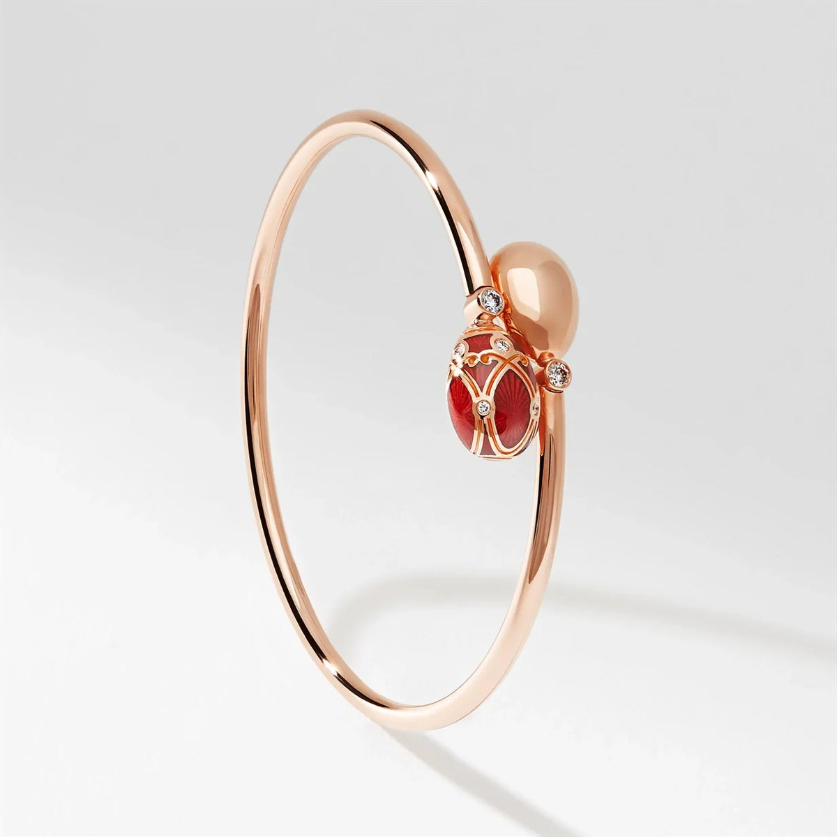 Handcrafted in 18-karat rose gold with one red guilloché enamel egg (14.51mm x 10.61mm x 5.25mm), one gold egg, and 9 brilliant-cut round white diamonds. Concealed ruby set inside the bracelet.