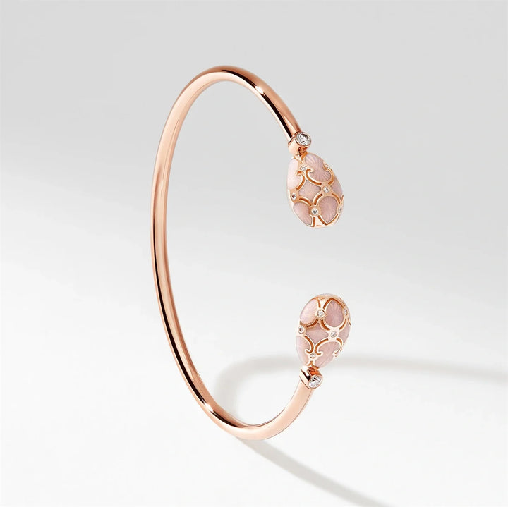 Handcrafted in 18-karat rose gold with two pink guilloché enamel eggs (14.51mm x 10.61mm x 5.25mm each), and 16 brilliant-cut round white diamonds. Concealed ruby set inside the bracelet.