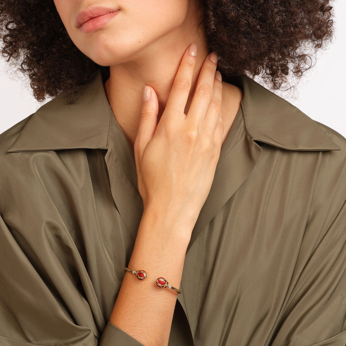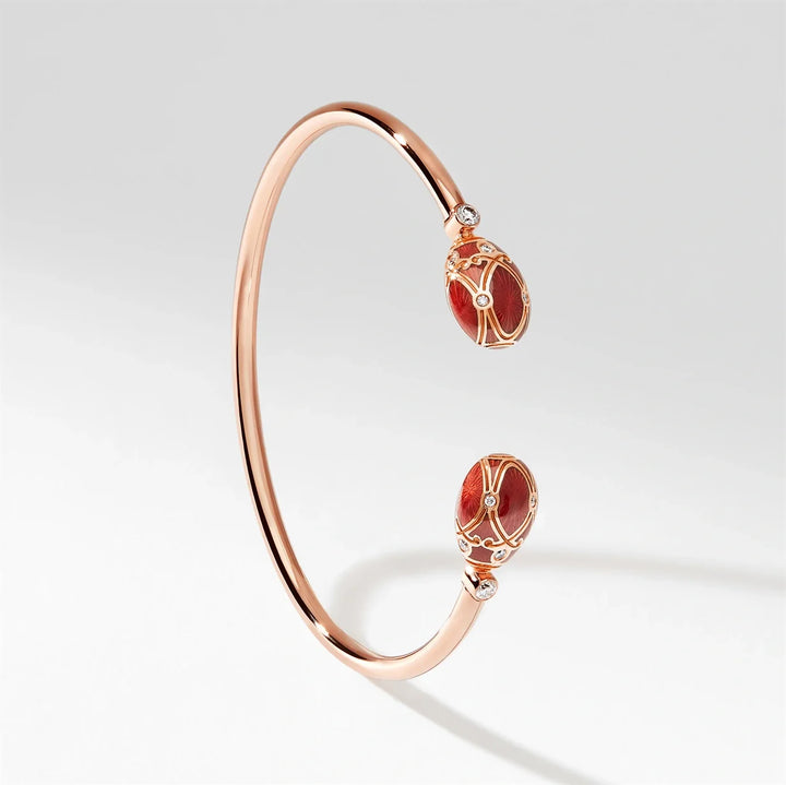 These Heritage Palais Rose Gold Diamond & Red Guilloché Enamel Open Bracelets by Fabergé are a vibrant and luxurious statement. Set in 18-karat rose gold, the bracelet features two striking red guilloché enamel eggs, complemented by 16 brilliant-cut round white diamonds. The shimmering red enamel, created with the rare guilloché technique, gives the piece a dynamic, fluid quality that changes with movement. A hidden ruby inside the bracelet signifies love and connection, a meaningful touch that adds to the piece’s emotional significance.