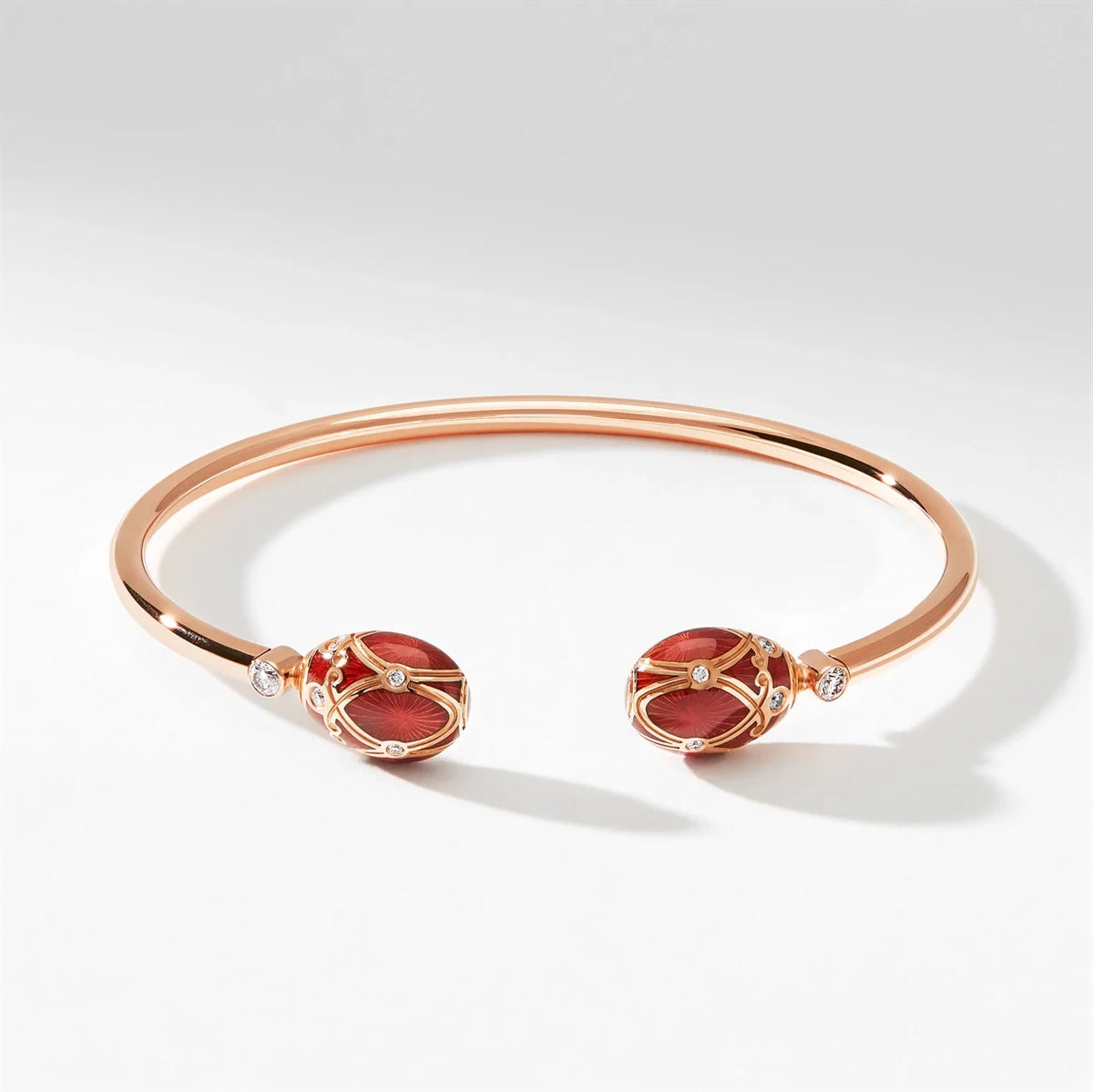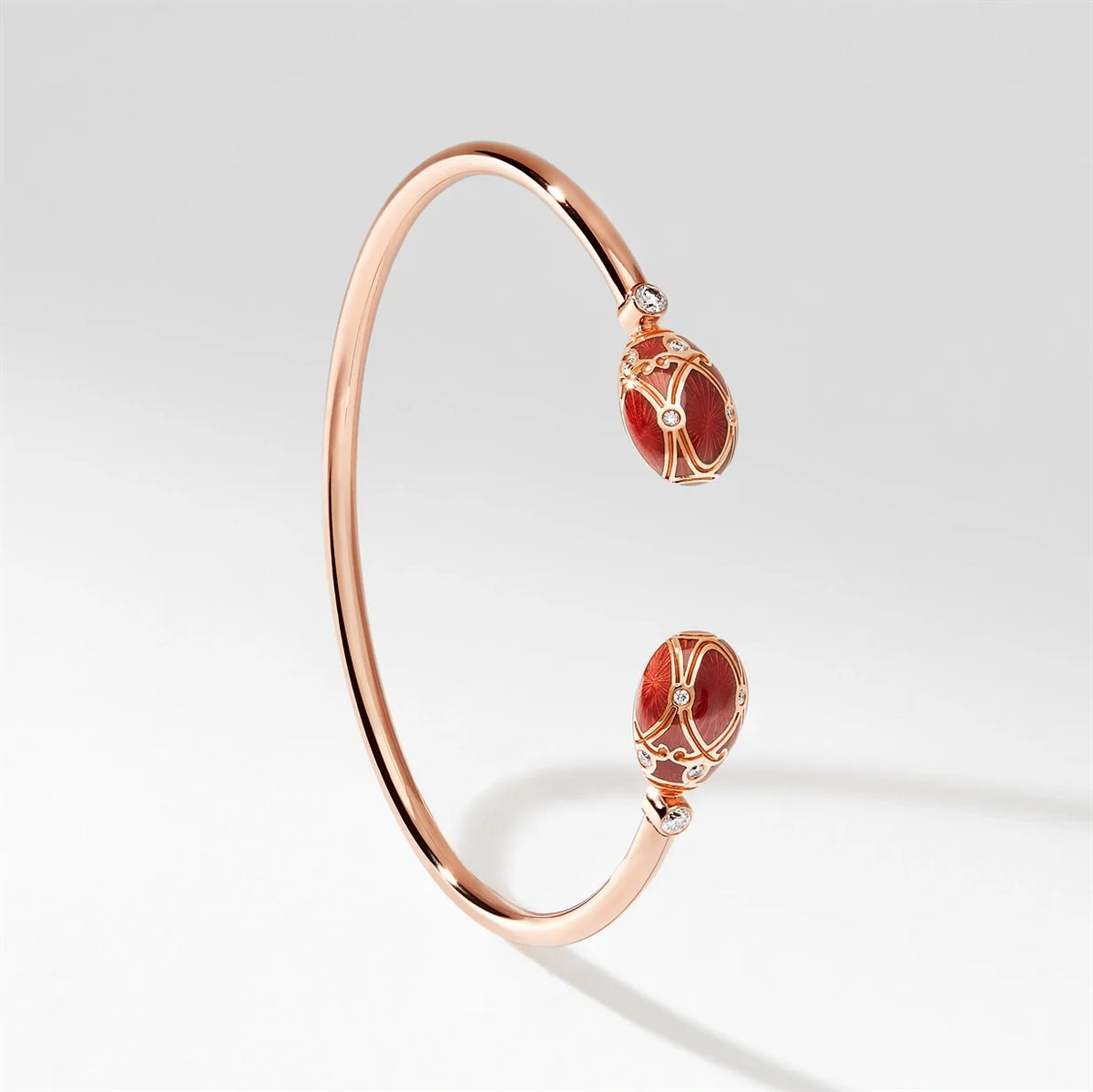 Handcrafted in 18-karat rose gold with two red guilloché enamel eggs (14.51mm x 10.61mm x 5.25mm each), and 16 brilliant-cut round white diamonds. Concealed ruby set inside the bracelet.