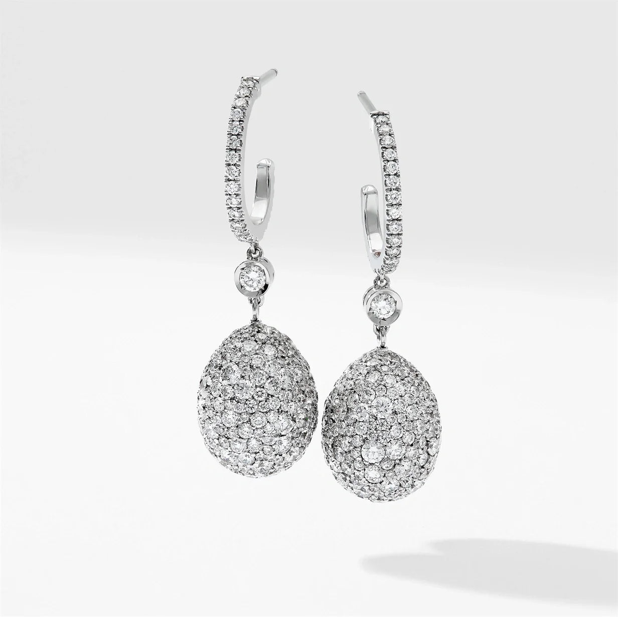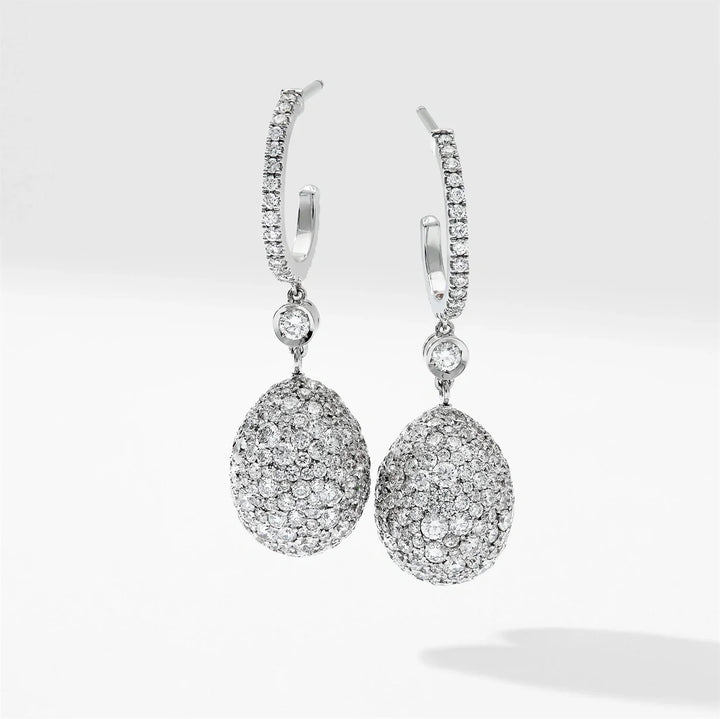 These Emotion White Gold Diamond Egg Drop Earrings by Fabergé are a refined and bold addition to the Emotion collection. Set in 18-karat white gold, the earrings feature round white diamonds, creating an elegant yet daring contrast against the sleek white gold. Infused with intense color and emotion, these earrings explore vivid color as an expression of feeling, drawing inspiration from Bohemian, Impressionist, and Fauvist movements. The earrings push the boundaries of traditional design, making a striking statement in true Fabergé style.