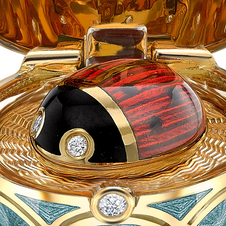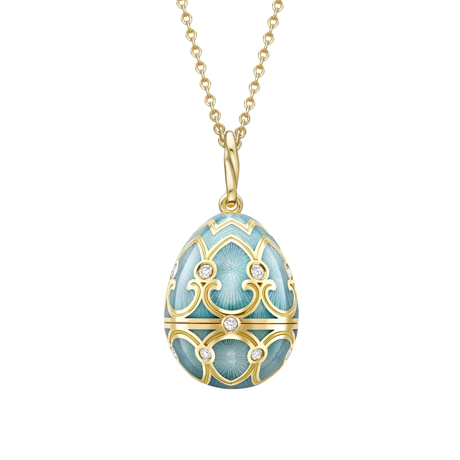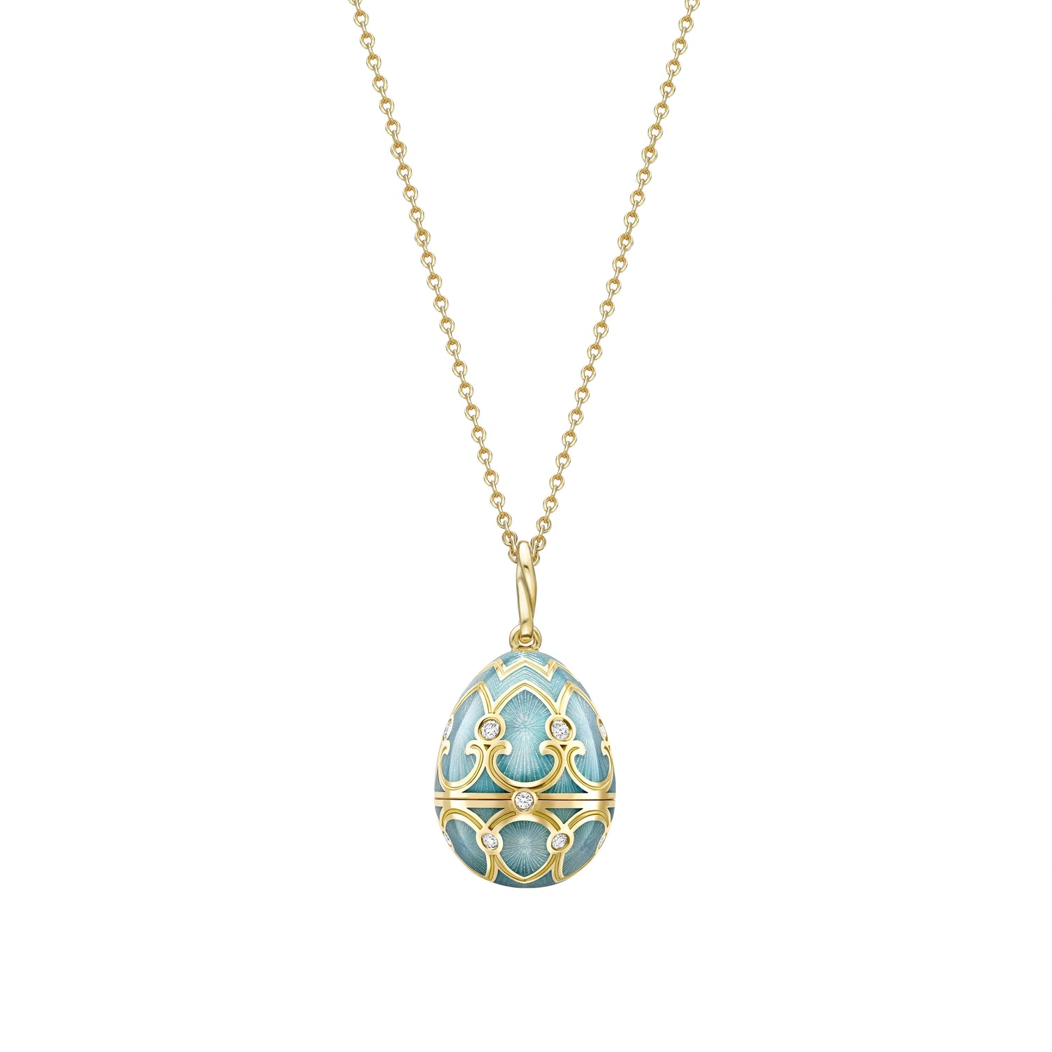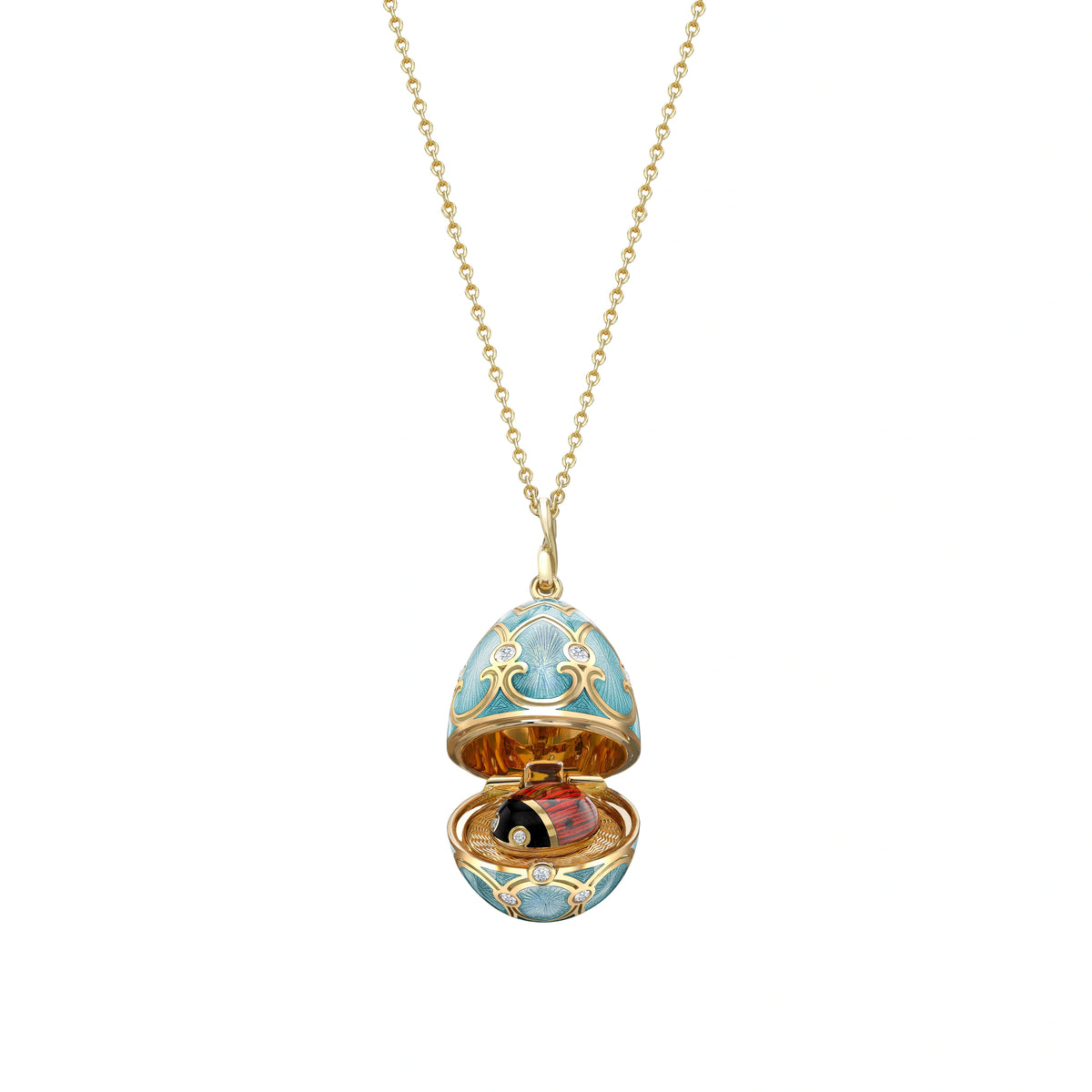 This Heritage Yellow Gold Diamond & Turquoise Guilloché Enamel Ladybird Surprise Locket by Fabergé is an enchanting and playful design, set in 18-karat yellow gold. The 22mm locket is adorned with turquoise guilloché enamel and round white diamonds. Inside, a hidden ladybird, decorated with red and black enamel, adds an element of surprise and whimsy. This locket, part of the Heritage collection, is a tribute to Fabergé’s historical artistry and craftsmanship, drawing on traditional materials and techniques like guilloché enamelling and hand-engraving. The locket is paired with an 18-karat yellow gold chain.