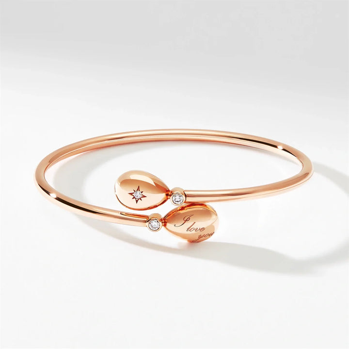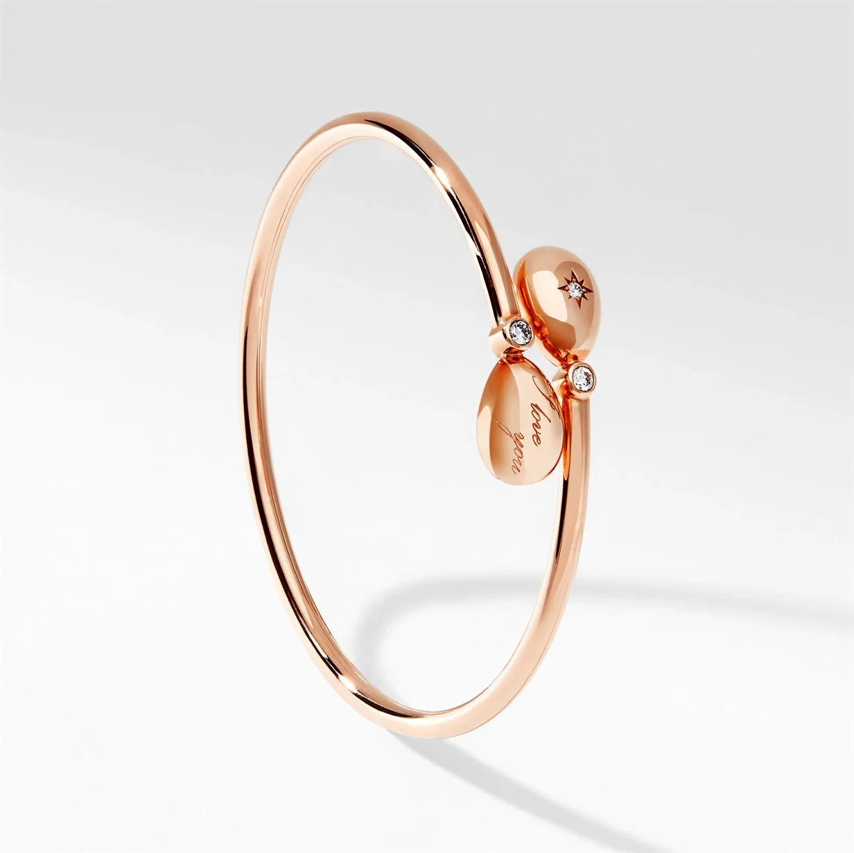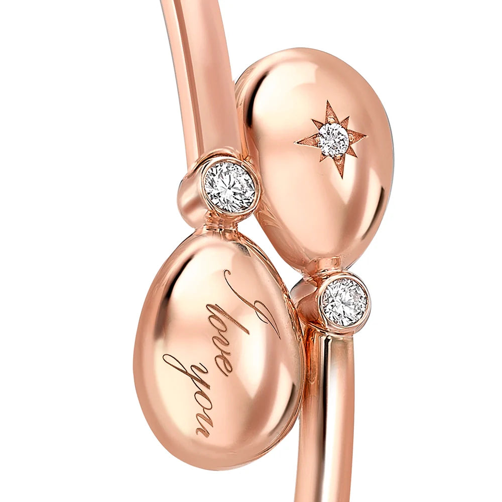 This 18k Rose Gold Diamond Crossover Bracelet with 'I Love You' Engraving by Fabergé is a heartfelt expression of love, combining a fine, contemporary design with sentimental charm. The bracelet is set in 18-karat rose gold, adorned with 3 round brilliant-cut white diamonds, and engraved with the words 'I Love You,' adding a personal touch. Fabergé has concealed a ruby inside the bracelet, a hidden gem that touches the skin and signifies the special bond between you and your loved one. Part of the Essence collection, this bracelet celebrates surprise and wit, with a modern take on the legacy of the Imperial Eggs.