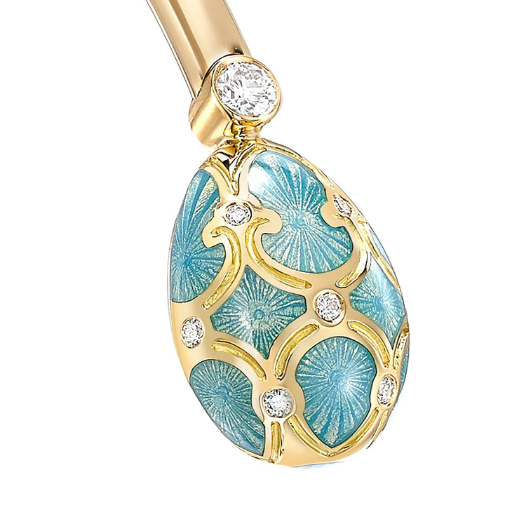 Handcrafted in 18-karat yellow gold with turquoise guilloché enamel and 16 brilliant-cut round white diamonds. Eggs measure 14.51mm (L) x 10.61mm (H) x 5.25mm (W). Concealed ruby inside.