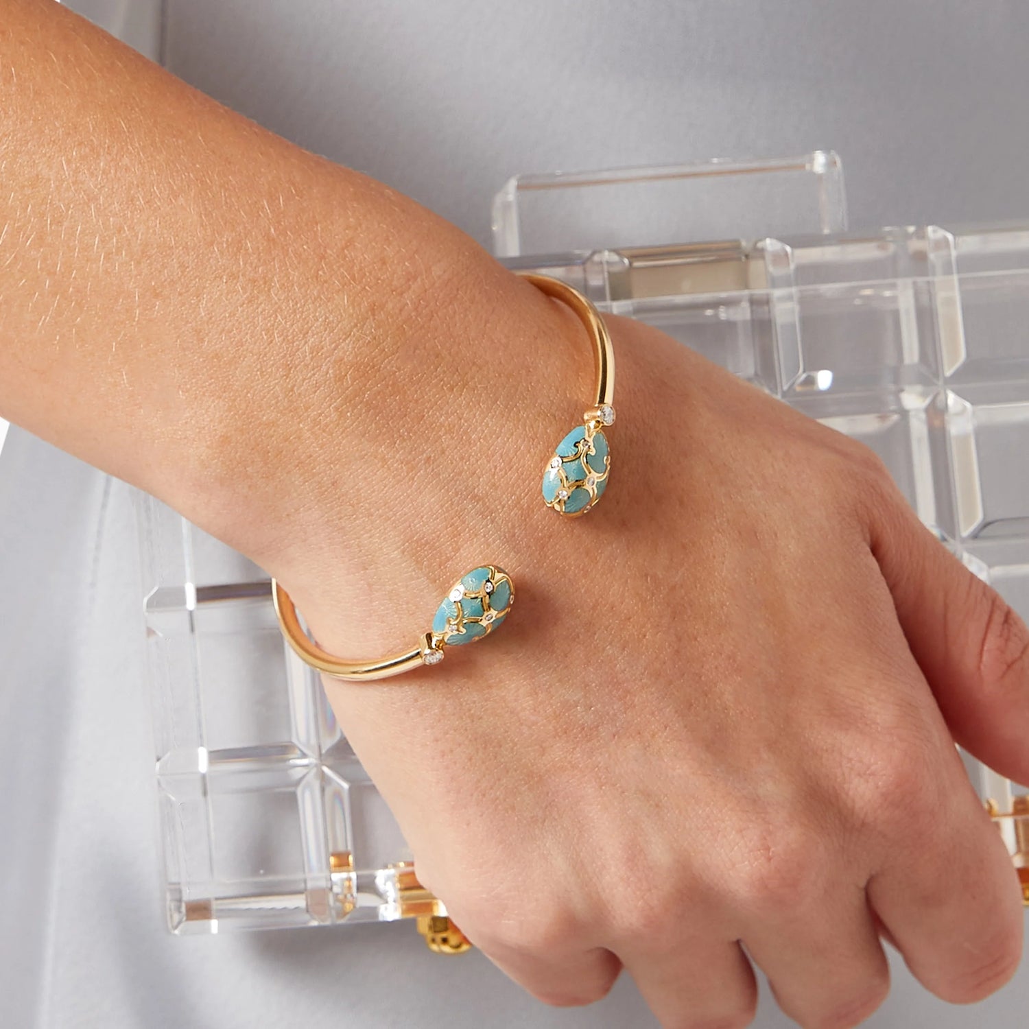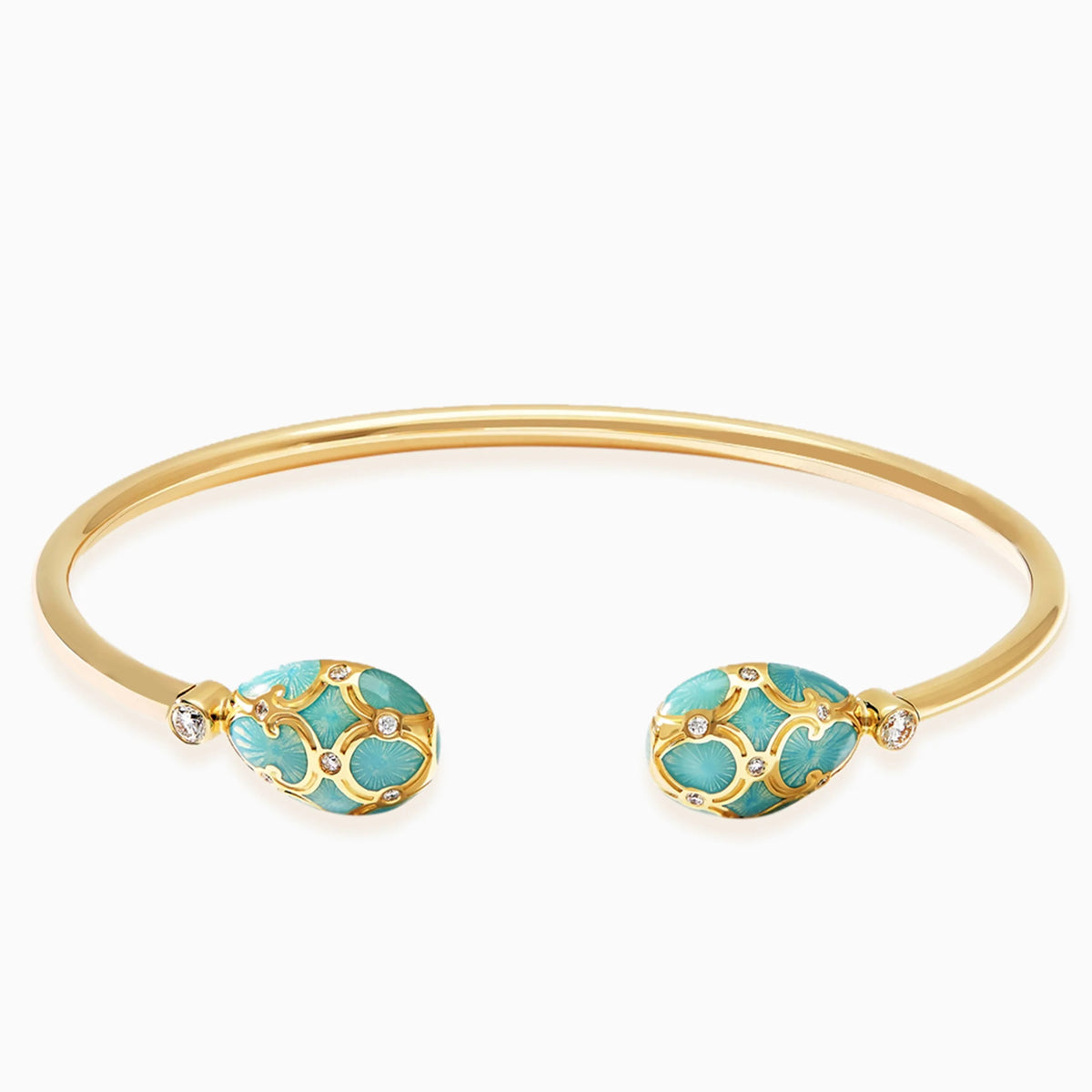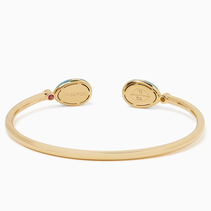 This Heritage Yellow Gold Diamond & Turquoise Guilloché Enamel Open Bracelet by Fabergé is a striking and timeless piece, inspired by the original imperial eggs. Set in 18-karat yellow gold, this open bracelet features two turquoise guilloché enamel eggs, adorned with 16 brilliant-cut round white diamonds. The eggs measure 14.51mm in length, 10.61mm in height, and 5.25mm in width. The use of the intricate guilloché enamel technique creates a liquid silk effect that moves with the wearer. A concealed ruby inside the bracelet represents a hidden bond of love and affection.