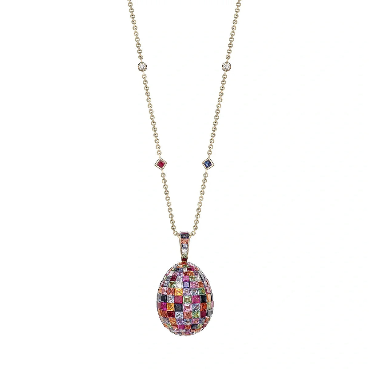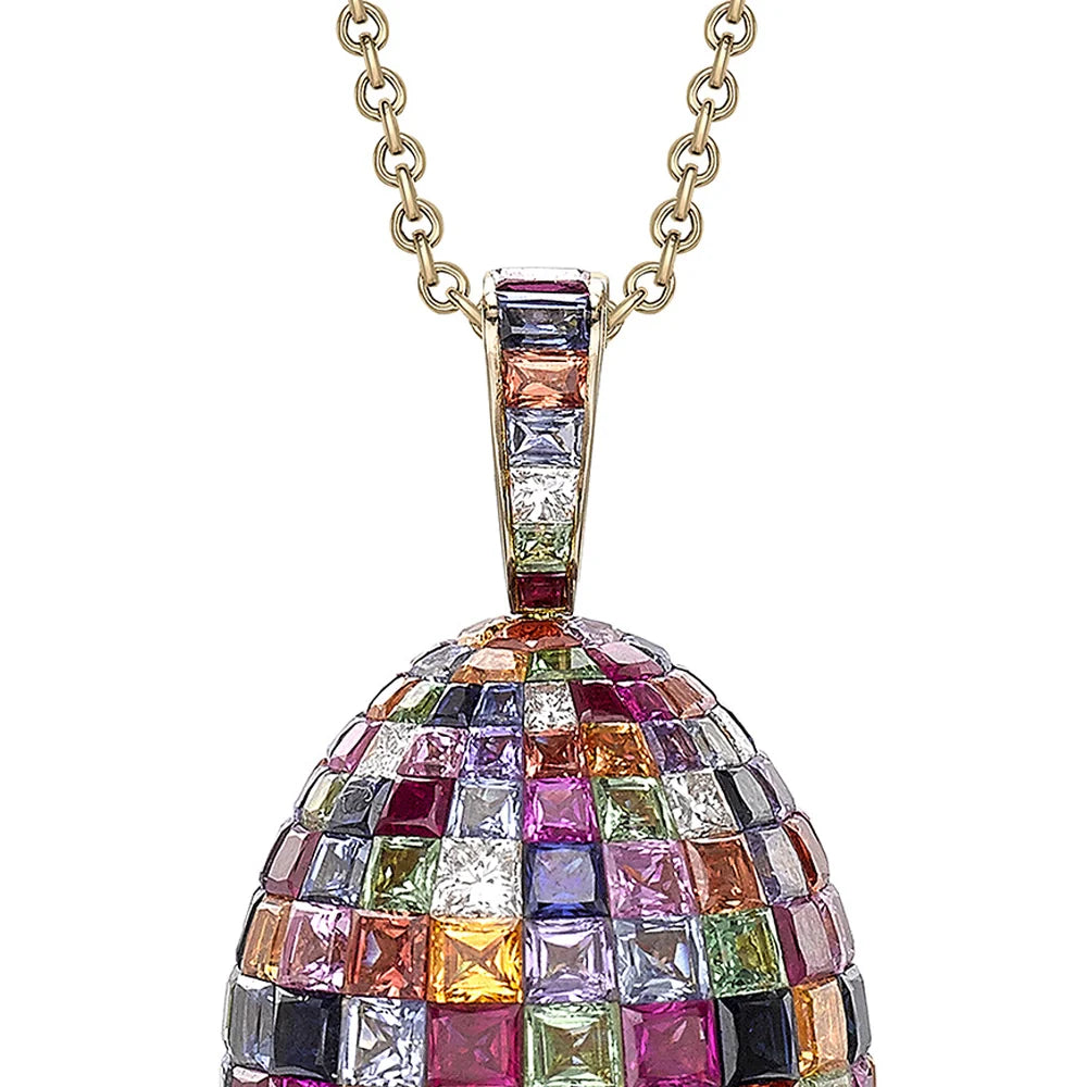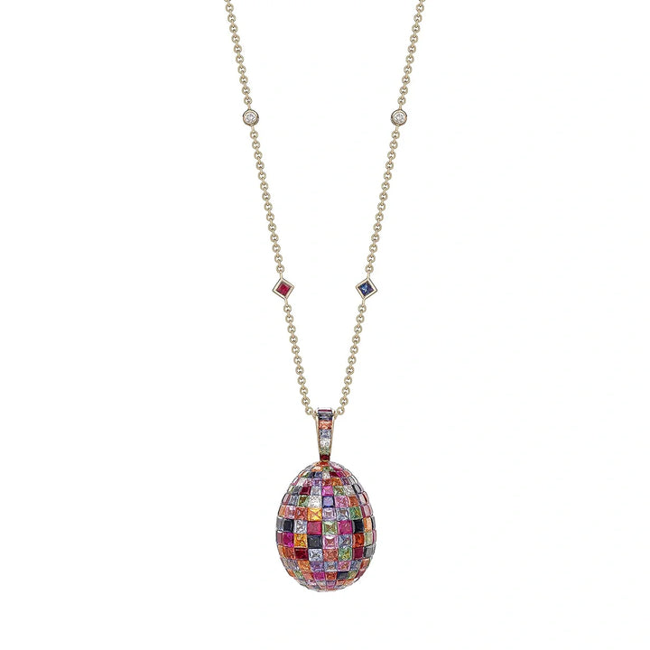 The Fabergé Imperial Yellow Gold Mosaic Ruby, Sapphire & Diamond Egg Pendant features invisibly-set princess-cut multi-coloured sapphires, Mozambican rubies, tsavorites, and white diamonds, set in 18-karat yellow gold. The pendant measures 26mm, and the 18-karat yellow gold chain is adorned with the same gemstones. This piece exemplifies Fabergé’s commitment to exceptional artistry and craftsmanship.