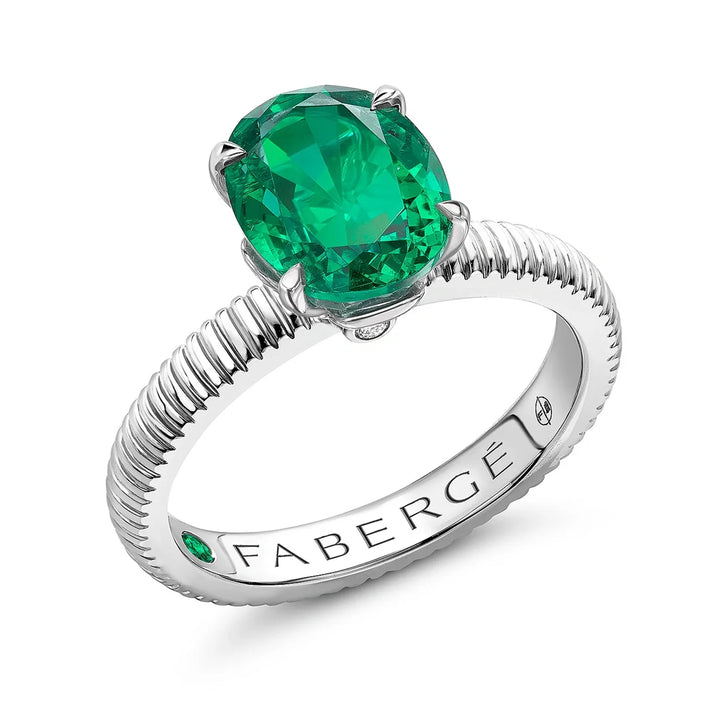 This Colours of Love White Gold Emerald Fluted Ring by Fabergé features a stunning oval Zambian emerald center stone, set in 18-karat fluted white gold. The concealed matching emerald inside the band adds a unique, personal element to this exceptional piece. True to Fabergé’s philosophy of delight and discovery, this ring celebrates the beauty of color through its vibrant gemstone and impeccable craftsmanship, all while maintaining a sense of exclusivity and artistry.