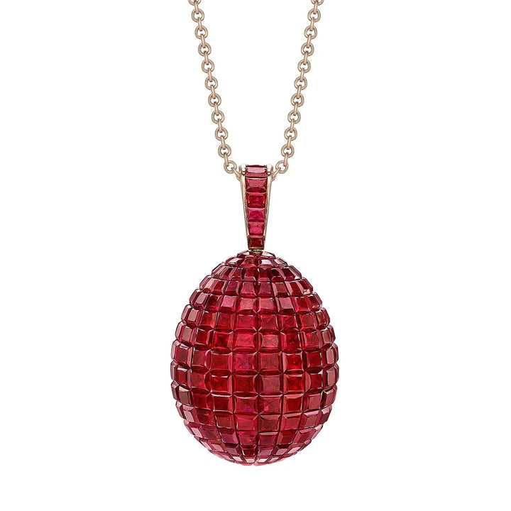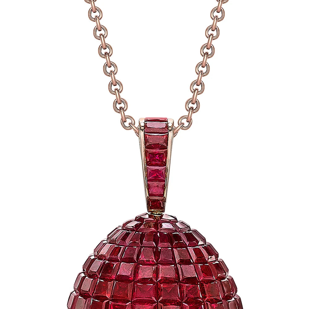 Handcrafted in 18-karat rose gold, featuring 284 invisibly-set princess-cut Mozambican rubies and white diamonds on the chain. The egg pendant measures 26mm in length.