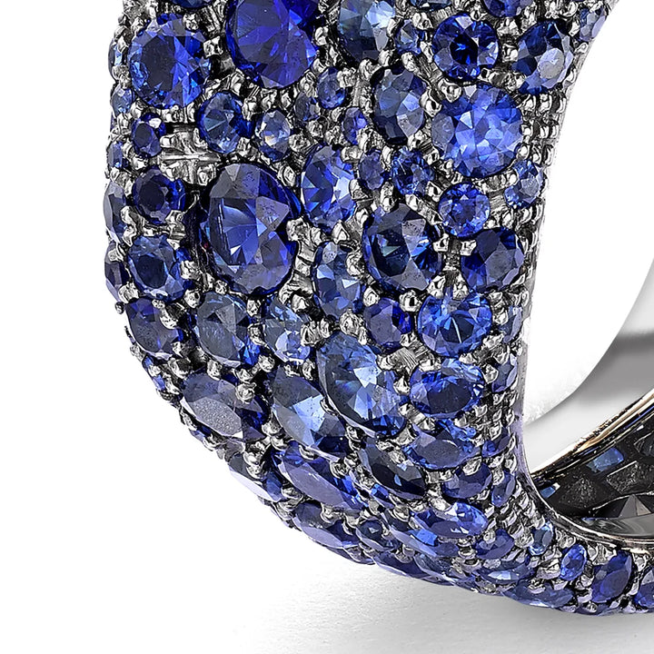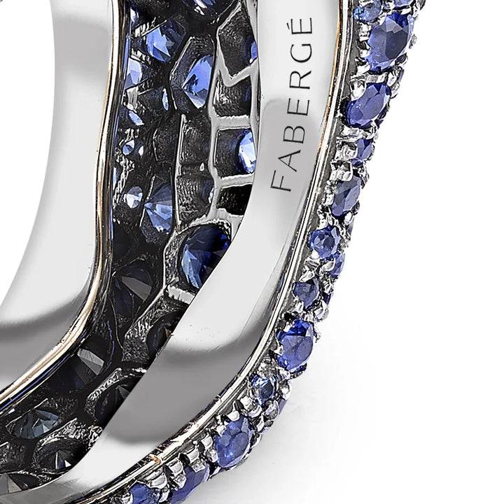 This Emotion White Gold Blue Sapphire Grand Ring by Fabergé is a bold, dramatic statement piece. Dozens of striking round blue sapphires are set in 18-karat white gold, creating a stunning display of vivid color. The ring is a standout in the Emotion Collection, which explores the intellectual and artistic depth of color, and reflects Fabergé’s unique ability to push the boundaries of design and craftsmanship. Drawing inspiration from Bohemian, Impressionist, and Fauvist interpretations of color as an emotional force, this ring is a powerful expression of feeling.