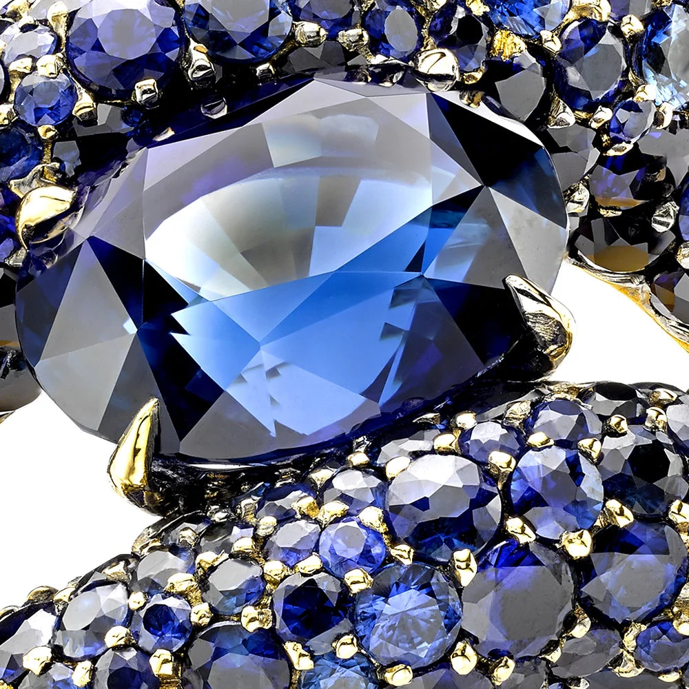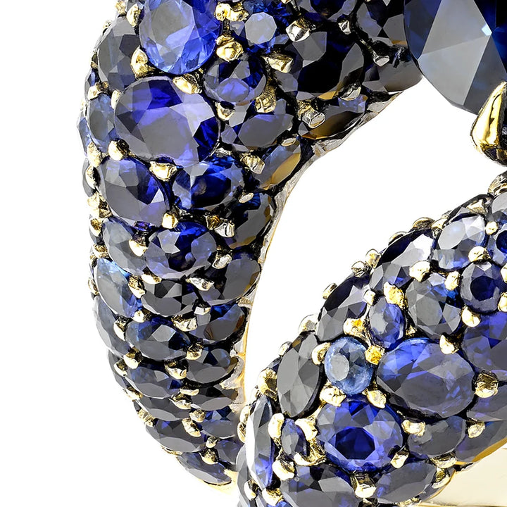 Handcrafted in 18-karat yellow gold, featuring an oval blue sapphire center stone and over 300 round pavé-set blue sapphires.